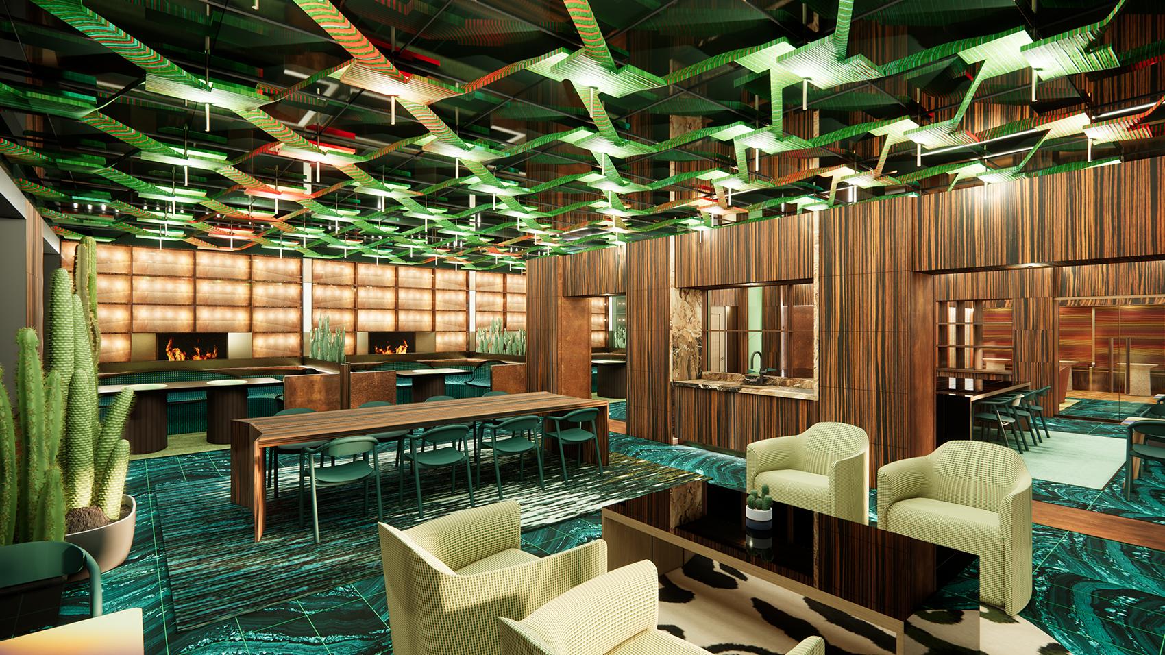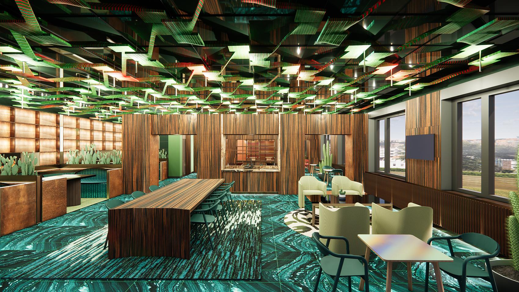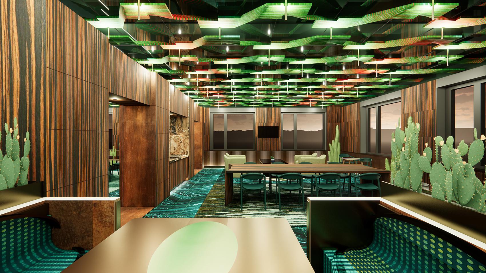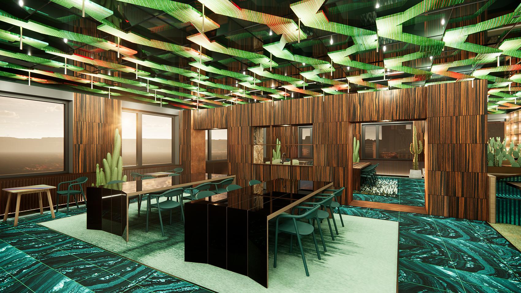 First program is a coworking desk area: black mirrored desks reflect lights from the mirror ceiling, bouncing vivid colors. Tensile felt acoustic panels absorb sounds; they are anchored by the metal fins, which are used to mount point lighting fixtures. Lights create a glistening effect all around the room. Green felt, carpets and tiles are representative of ever-growing nature. In Juxtaposition, macassar ebony wood is used to create free standing millwork walls.