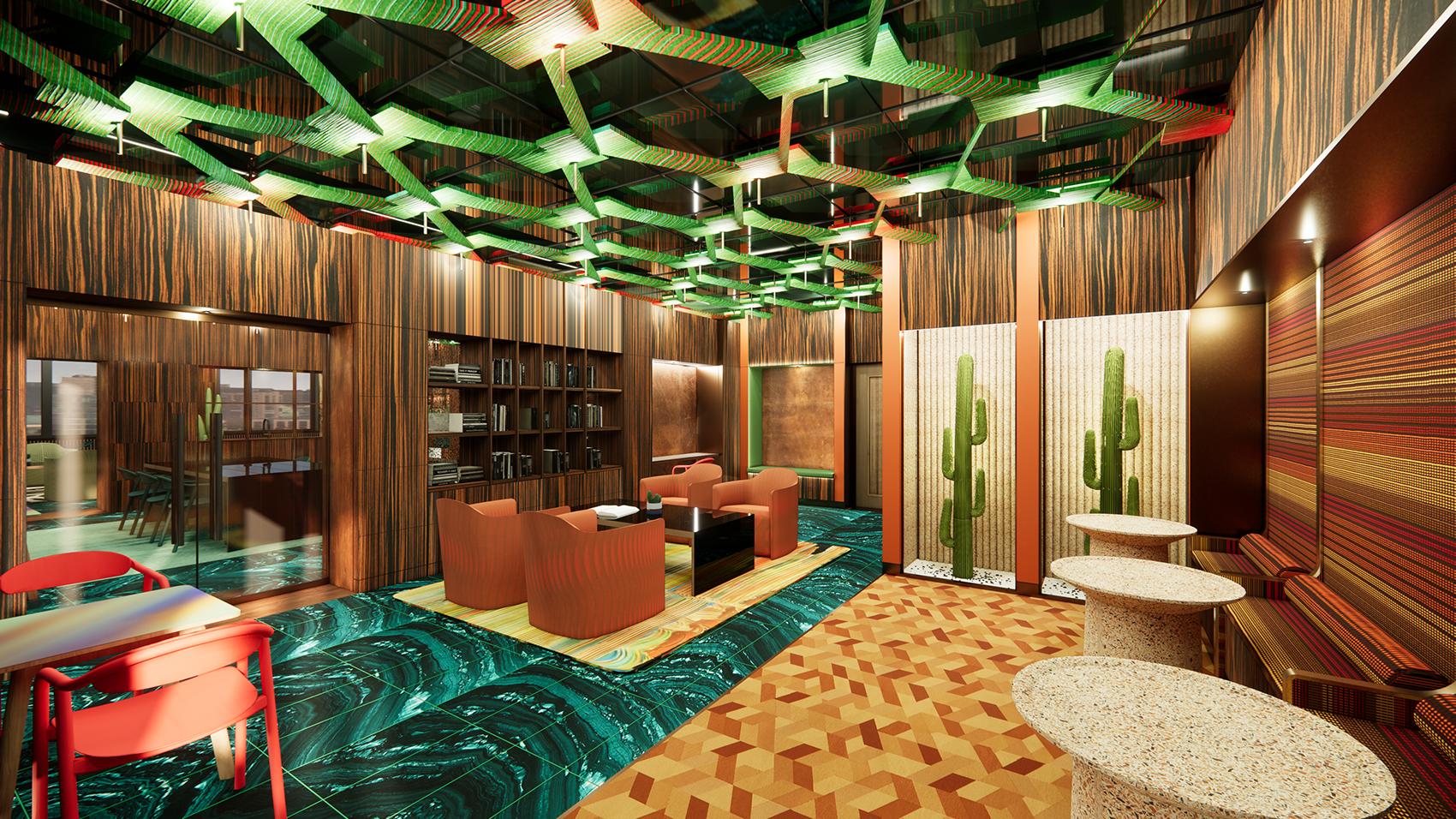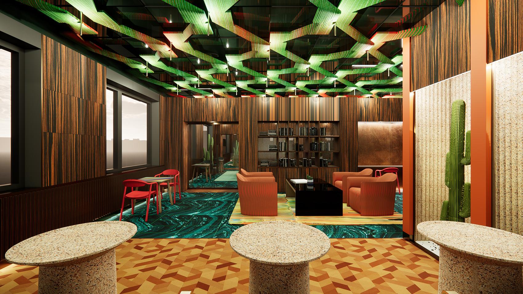 The designer proposes a daring library next. While other areas have forest-like quality, the library has a desert-like quality. Alongside the cactus, the banquette is juxtaposed with earthy terrazzo tables. The mirror ceiling continues throughout, making a visual connection to areas beyond walls. The contrast between the green tile and red cork tile also add to the “edge” of the library. The millwork wall serves as a bookshelf, and a striking backdrop for soft furniture. Through and through, this space captures unexplored, wonderous character of nature. By bringing nature to the urban workforce, the designer seeks to reframe what it means to live and work in cities. Instead of using the white minimal design, the designer hopes to awaken the wild creativity of the urban workforce through the “WORKforce of Nature.