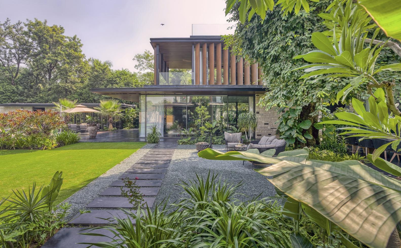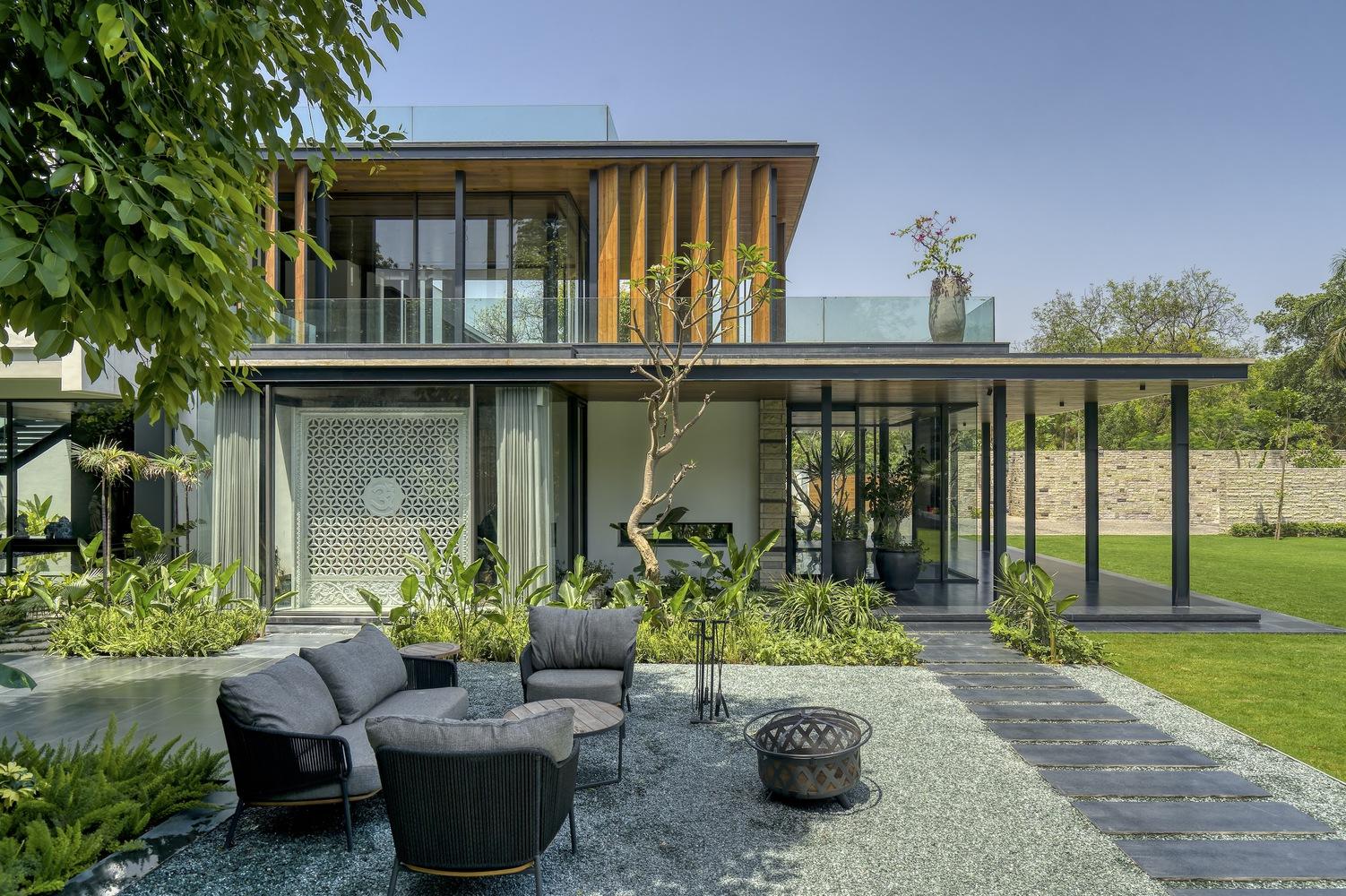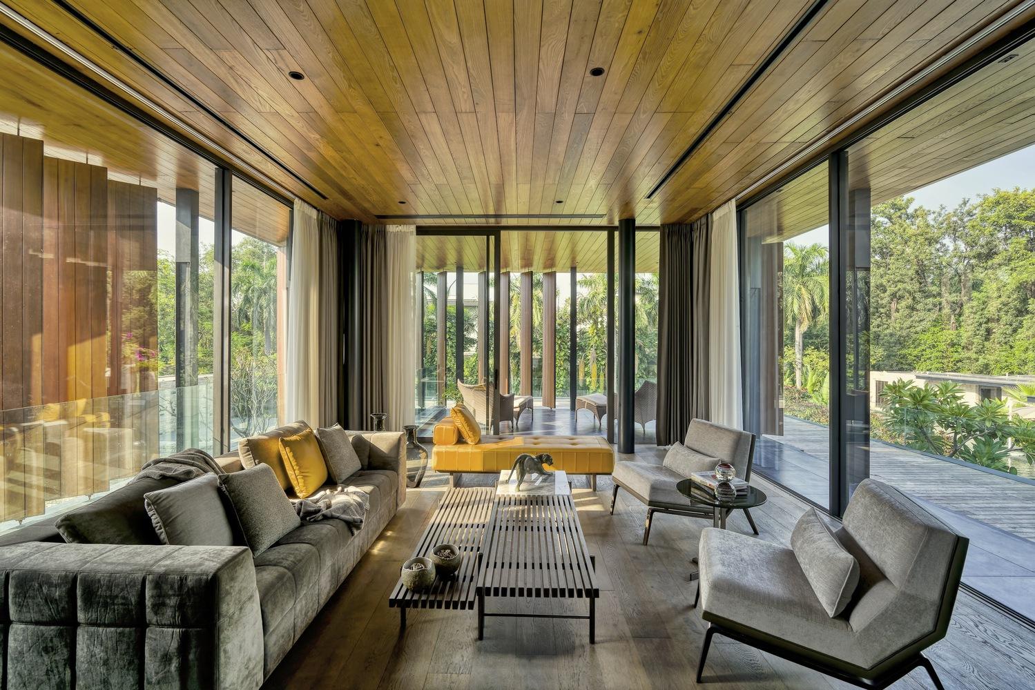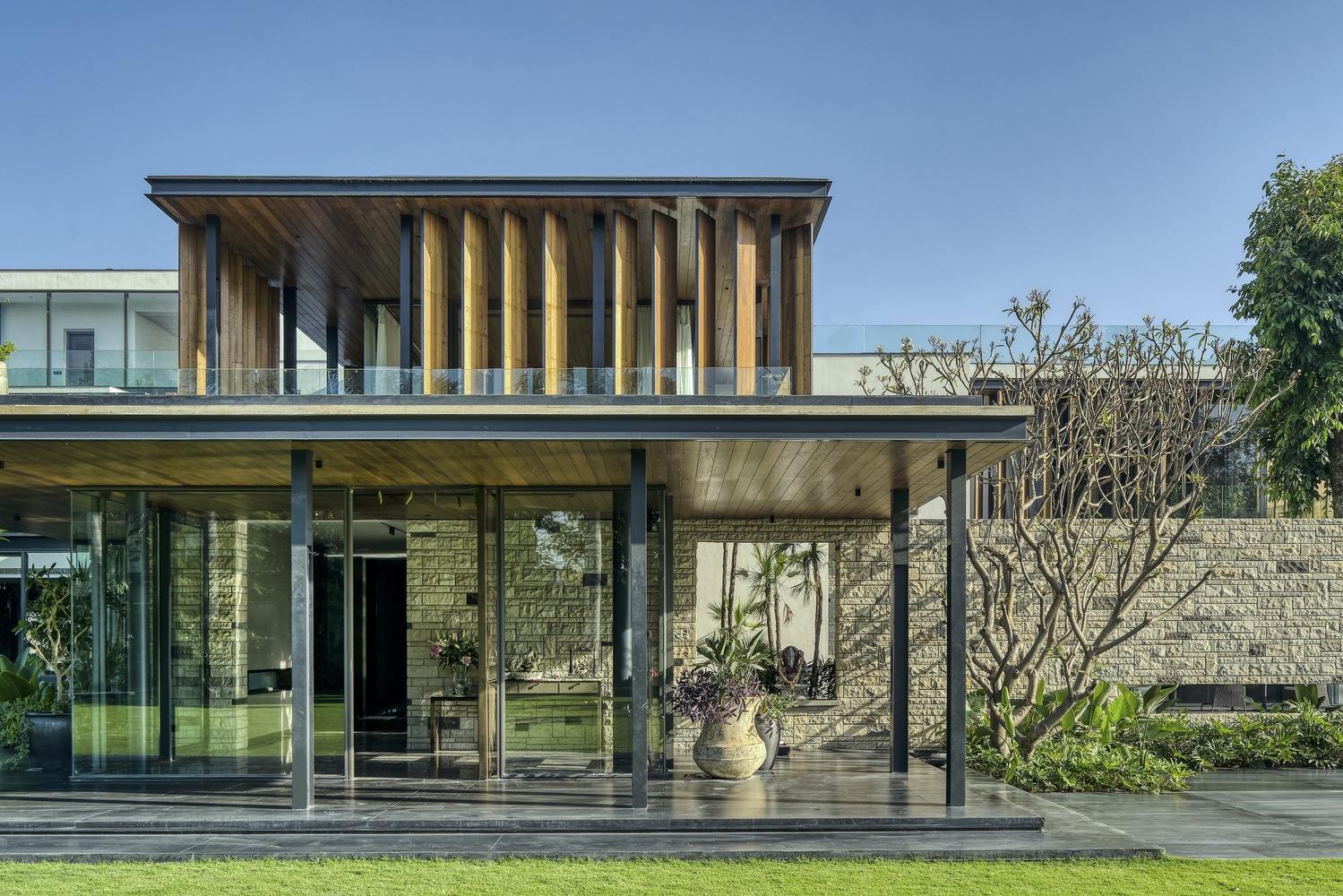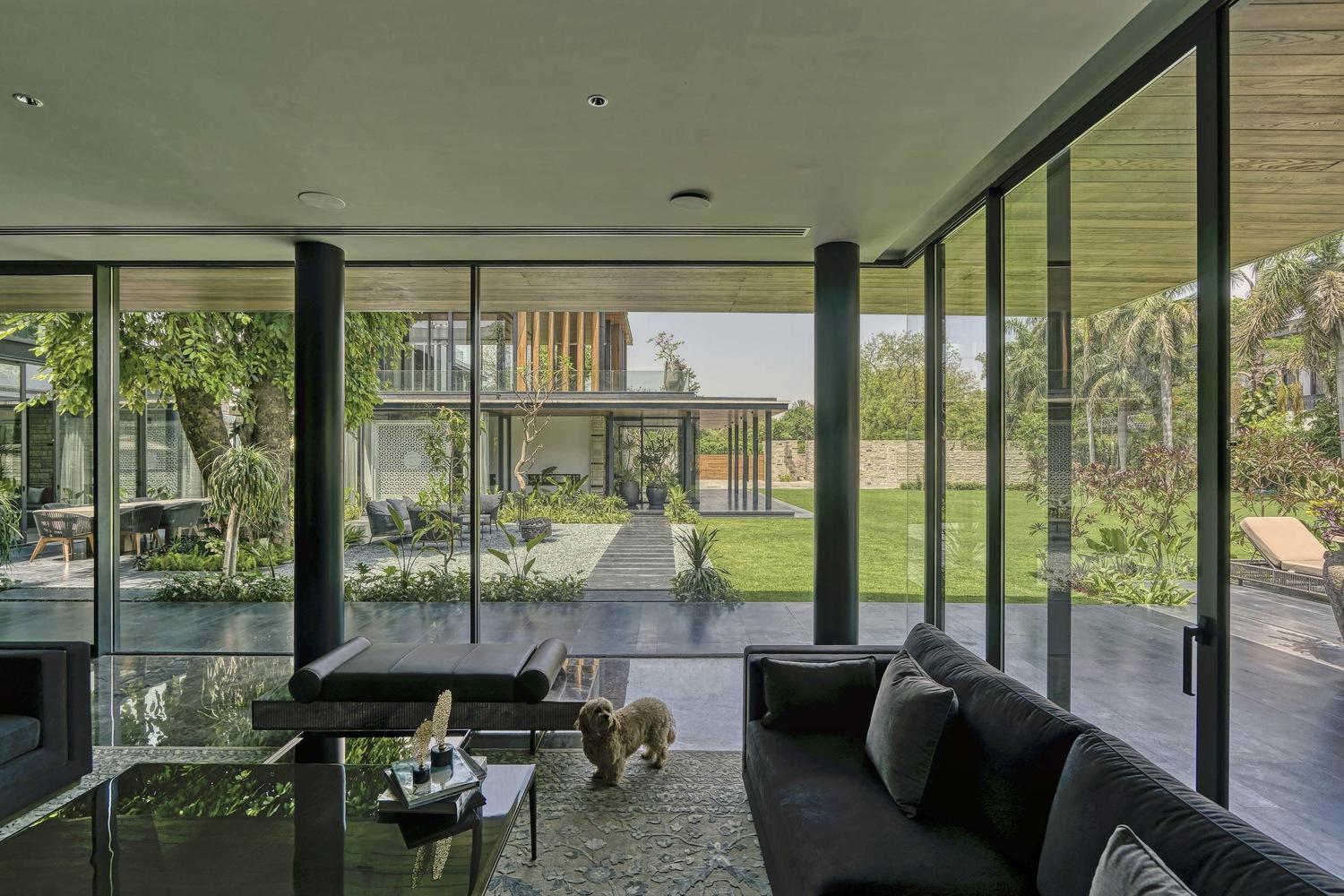 The Portico House gracefully embraces the lush canopy of the twin Jamun trees, seamlessly connecting the indoor and outdoor spaces through floor-to-ceiling glass elements. Along the edges of the tree-facing rooms, the design incorporates a continuous portico, which provides deep shaded terraces and porches. These porticos feature custom-made mild steel ‘H’ columns and hardwood-clad fins, adding a refined rhythm to the exterior façade. The same Portico design element extends to the welcoming entry patio, where the closely spaced and repetitive steel columns pay homage to traditional trabeated Indian architecture.