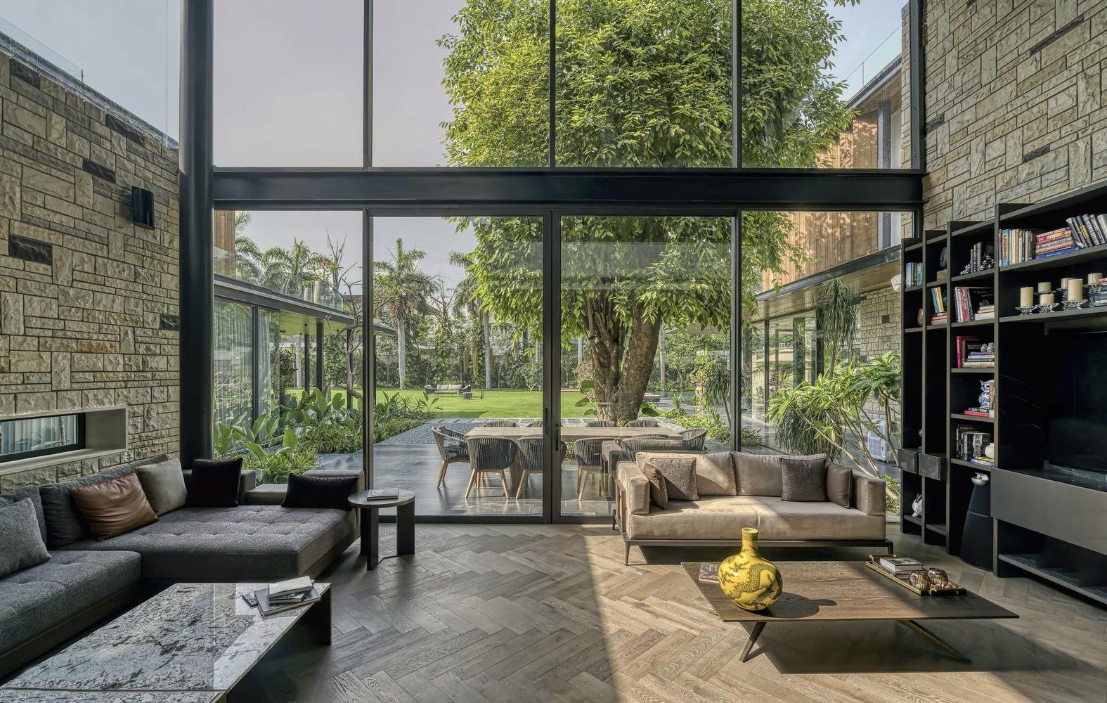 In response to the Sawhney family’s design preferences, the double-height informal lounge takes a central position overlooking the vibrant East Court, offering breathtaking views of the full canopy of the Jamun tree. Upstairs, an exceptional feature awaits with a peninsula-like lounge that extends outward, providing panoramic views from all three sides. The upper lounge, along with its 14-foot deep covered terrace, offers an immersive experience that brings the two magnificent Jamun trees into a single, harmonious setting.