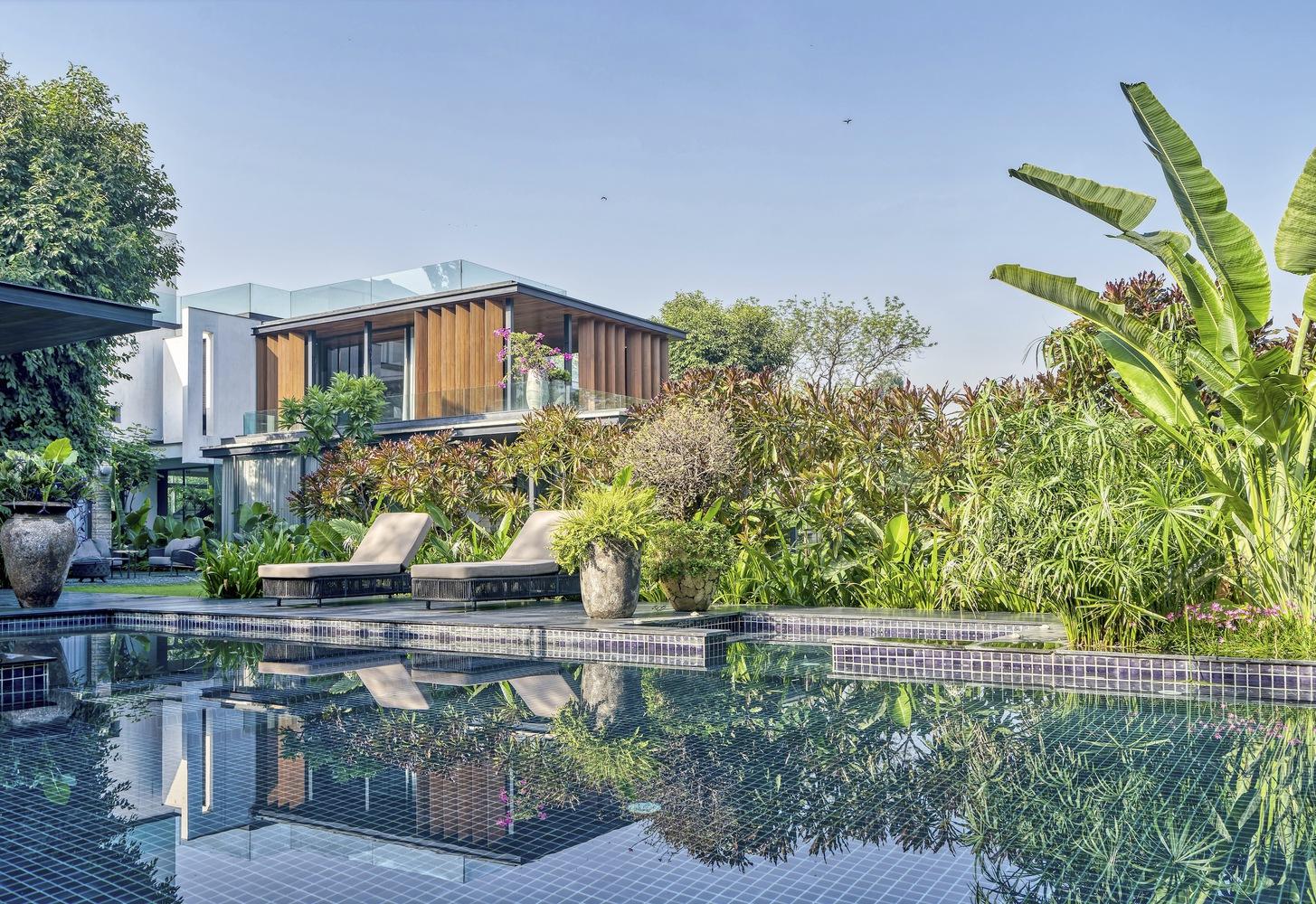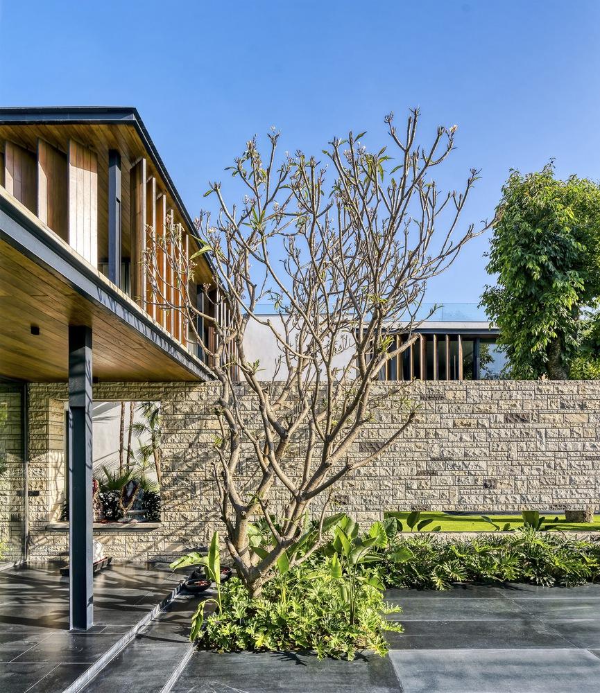 The landscape design of the Portico House plays a crucial role in linking the architecture with the natural environment. The courtyards, with their carefully curated plantings, provide a serene and lush setting that enhances the connection to nature. The integration of water features in the landscape adds a sense of calm and tranquility, creating spaces for relaxation and contemplation. The landscape design not only complements the architecture but also serves as an extension of the living spaces, blurring the lines between indoors and outdoors and enriching the overall living experience at the Portico House.