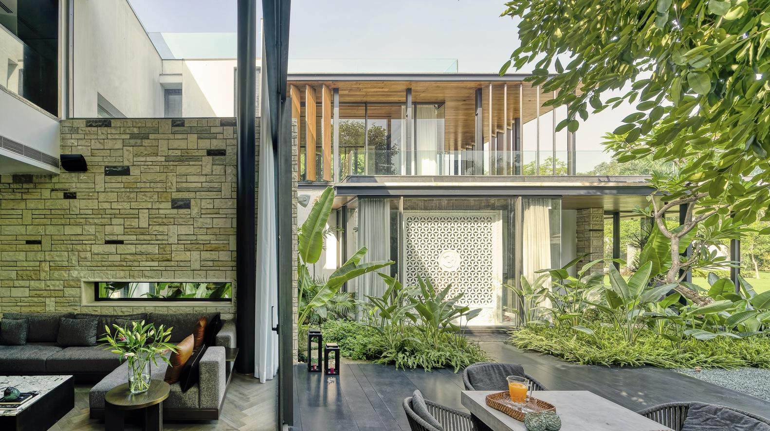 Situated on a 1-acre plot of land, the Portico House revolves around the presence of two majestic Jamun trees. These ancient trees take center stage in the overall design of the house, giving rise to two distinct courtyards: the East Court and the West Court. The East Court, a vibrant and festive space, is flanked by the house’s public areas, including formal and informal lounges, the entry lobby, and a puja room. In contrast, the West Court serves as a private sanctuary within the property.