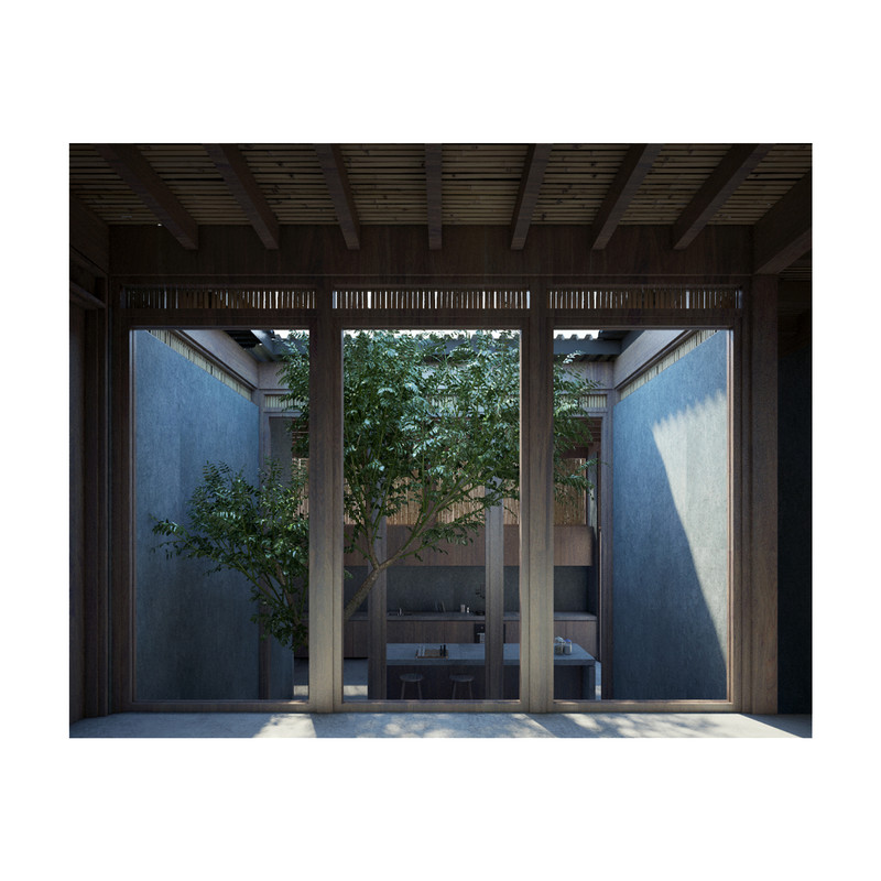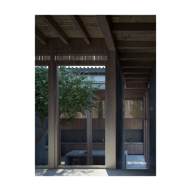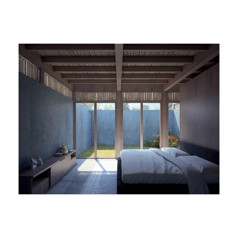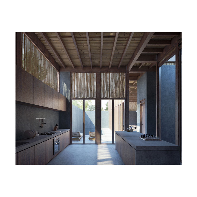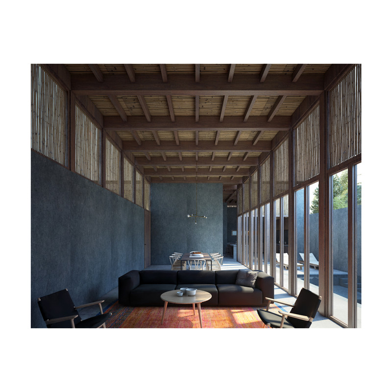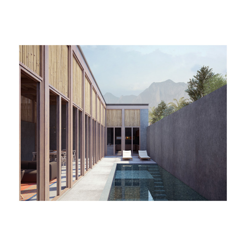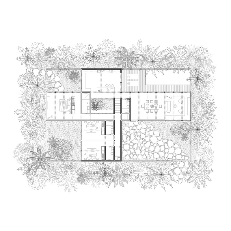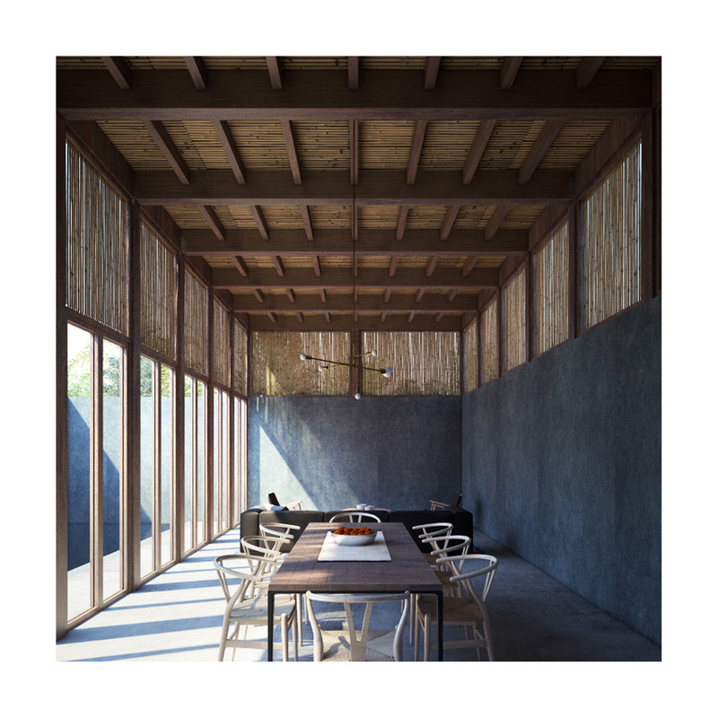 Surrounded by the treetops, the configuration of the house is around five courtyards. Under the wooden roof, the rooms are organized through the voids that define the house distribution. Wood panels and vertical reed cane, make up a cover that brings shade and shelter from the strong “huasteco” heat.