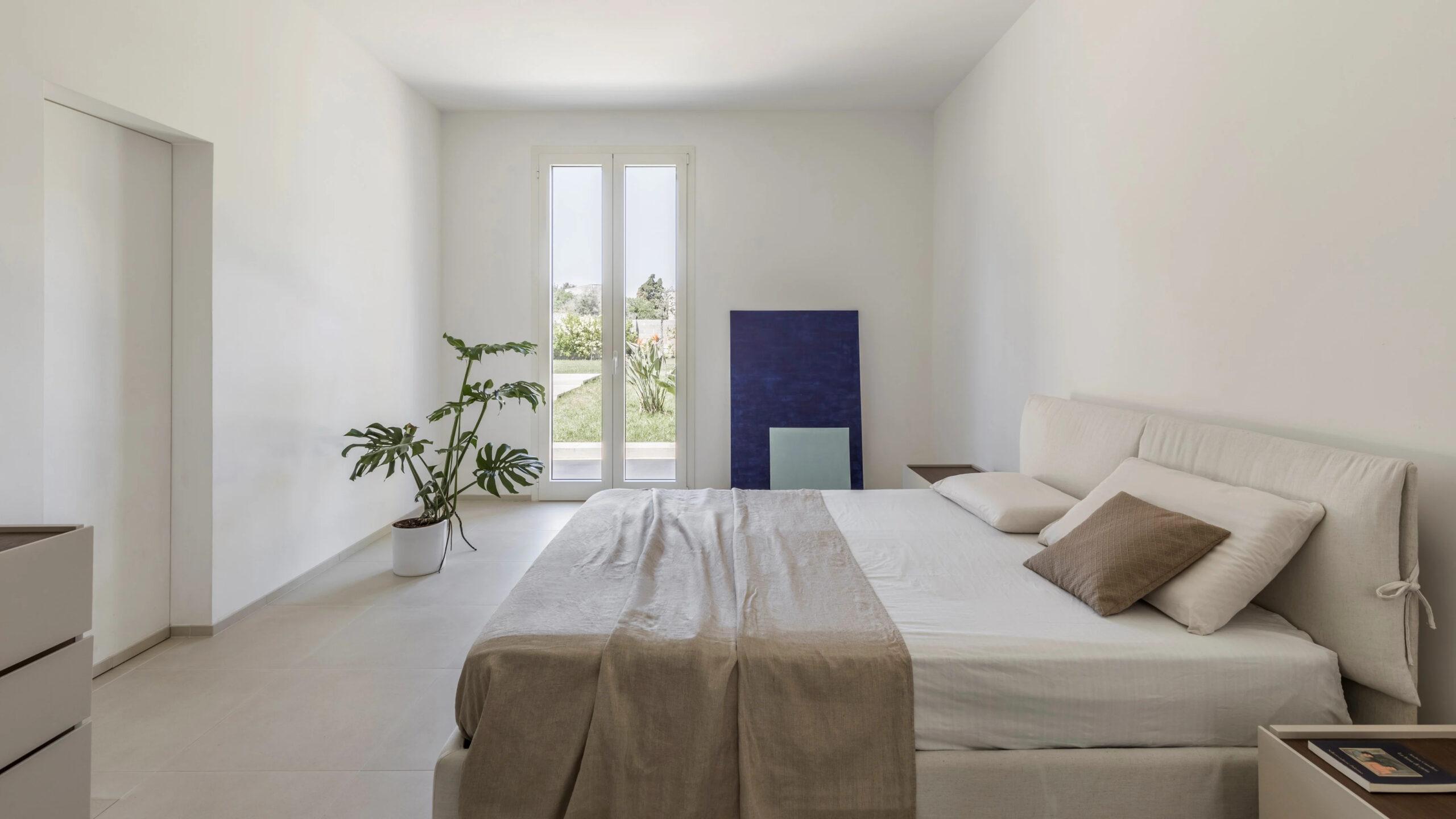 In keeping with the villa’s homage to local traditions, the materials used are a modern reinterpretation of regional staples. The walls are constructed using tufo stone, known for its durability and aesthetic appeal. The floors and finishes employ Lecce stone, a material synonymous with the region, providing a warm, natural look. Soft, white plasters line the interiors, creating a soothing contrast against the earthy tones of the stone.