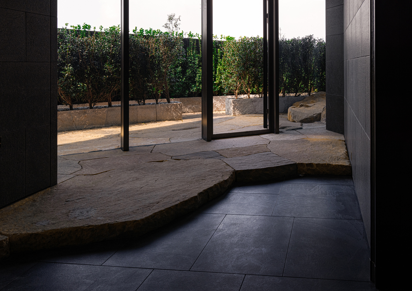 Upon entering the complex, visitors are greeted by an indoor foyer that sets the tone for the experience. The space utilizes Shanxi black paving, guiding guests through the entrance area. As they navigate the space, a turn around the corner reveals a stunning arrangement of rockeries and springs, offering a glimpse of the natural elegance that defines the complex. The journey continues into a small private room, which boasts a curved spatial site offering varied constraints and perspectives. Here, the framed views transition from the interior to the exterior, partly with raised tatami mats and sofas strategically placed before the windows, and partly open to the air. These three distinct window designs craft unique visual experiences, each influencing the landscape design in its own way.