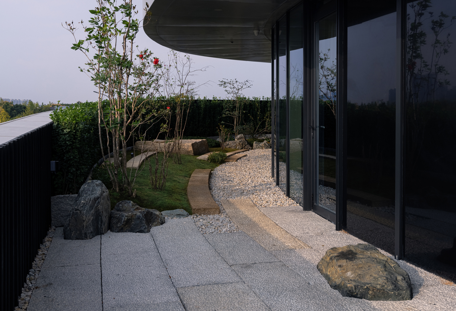 The tea house within the complex offers a serene and private retreat, in contrast to the more spiritually focused areas of the complex. This calm oasis is dedicated to tranquility and privacy, providing a peaceful respite from the bustling city. As visitors venture into the casual guest area, they encounter a landscape marked by giant objects, which, along with the mountains and springs at the entrance, form a captivating counterpoint. This juxtaposition beautifully retells the story of the entire complex, weaving together elements of nature, architecture, and art to create a narrative that is both visually stunning and deeply evocative. Guanyun Qiantang stands as a testament to the harmonious integration of natural beauty with urban sophistication, offering a unique and immersive experience that captures the essence of Hangzhou’s evolving urban landscape.
