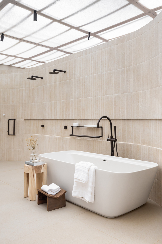 The spa’s architecture and interior design are crafted to reflect its ethos of calm and balance. We embraced a palette of beige tones throughout the space, creating a serene and harmonious environment. The choice of porcelain tiles in the bathroom, with their grainy texture reminiscent of natural minerals, adds an earthy, grounding element to the space. This choice of materials is not just aesthetic but also a nod to the natural world, reinforcing the spa’s commitment to creating an environment in sync with nature.