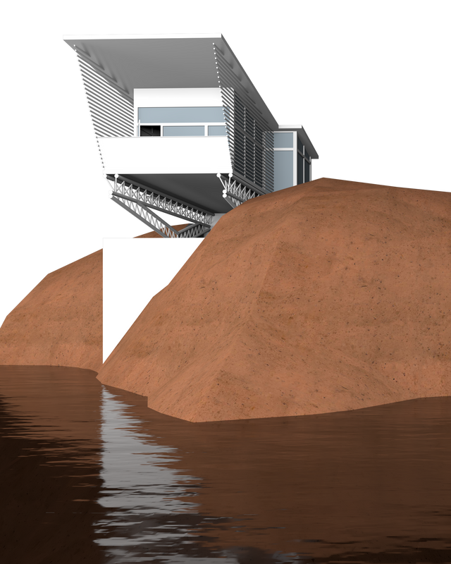 The bedroom is placed just behind the living area which is partially visible through the Jaali separation. The bedroom further leads to a spacious balcony which overlooks upon the lake. A docking platform is provided in the water for the purpose of roping a boat.