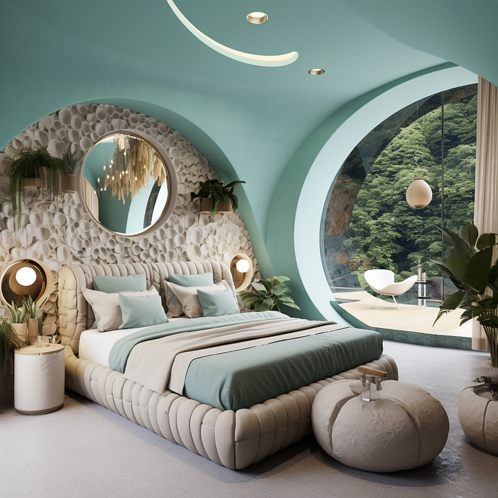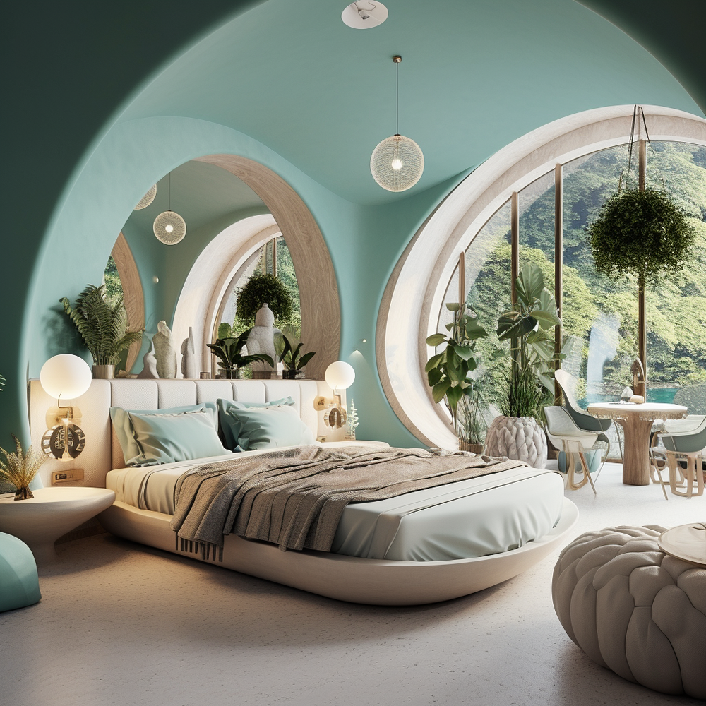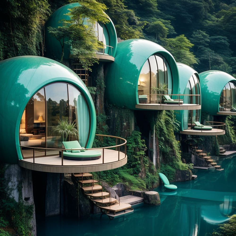 Adorning the exteriors of these sphere resorts are facades characterized by a Tiffany color palette. The facades boast shades of turquoise and blue-green, evoking a sense of tranquility and sophistication against the backdrop of the vibrant jungle. These hues harmonize with the surrounding flora, creating a captivating visual contrast and adding an air of elegance to the cabin’s exteriors.