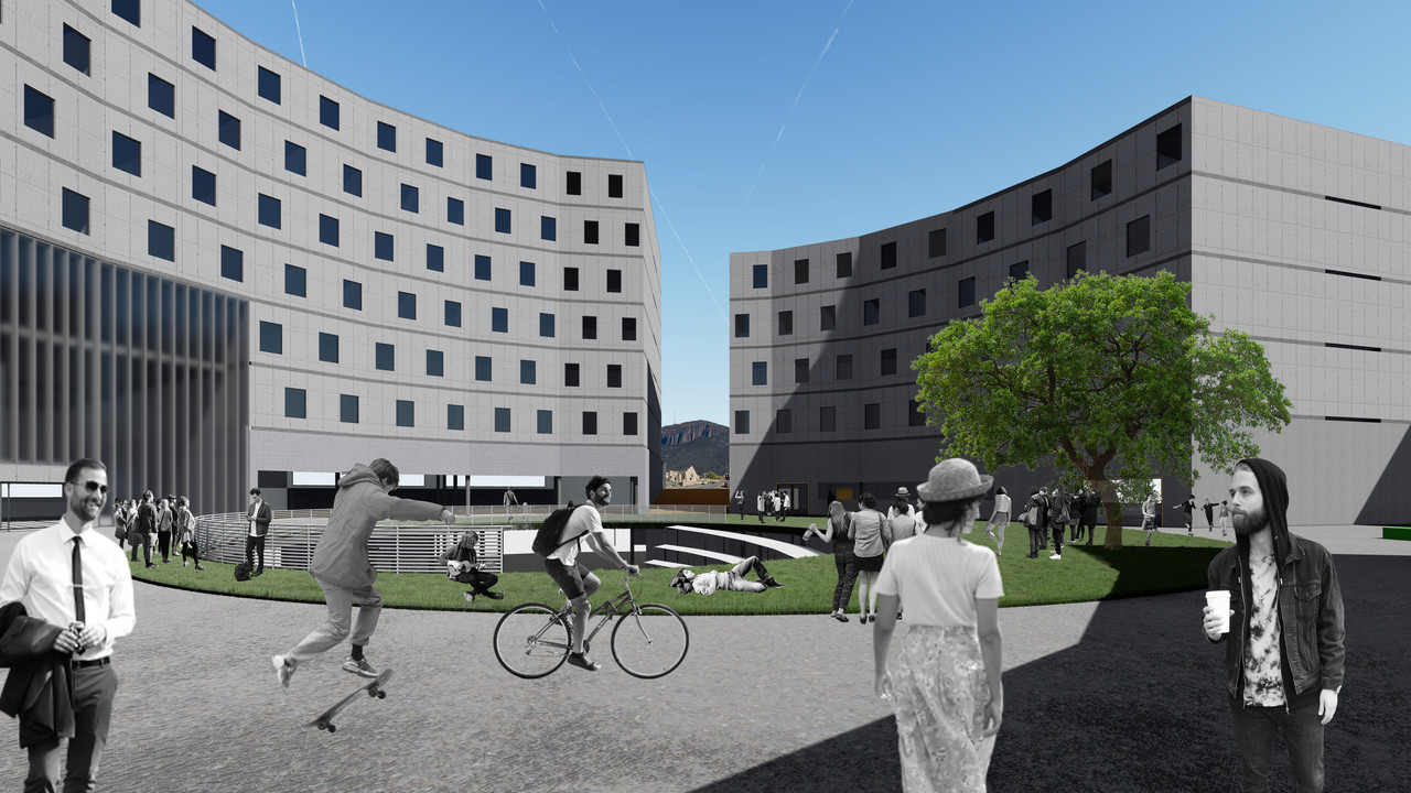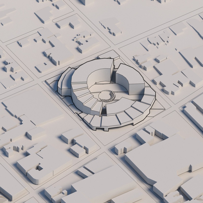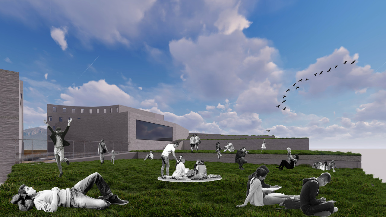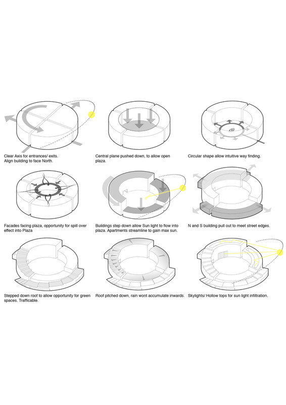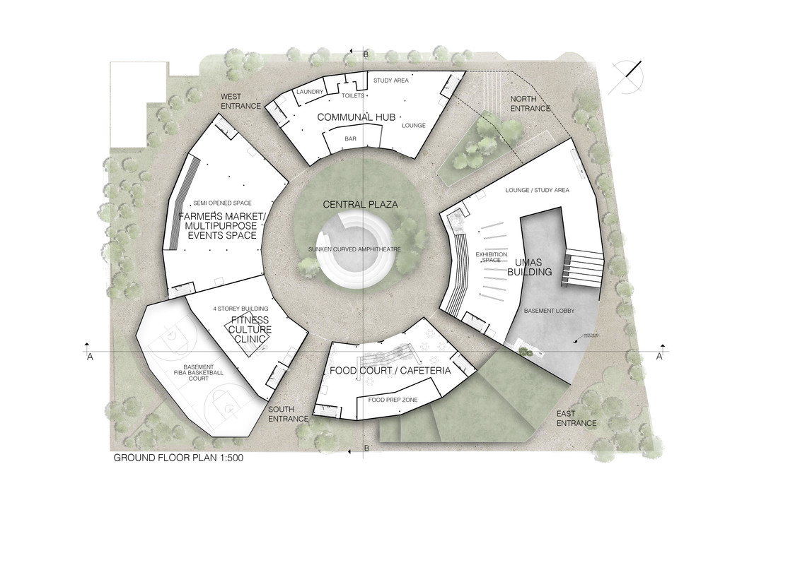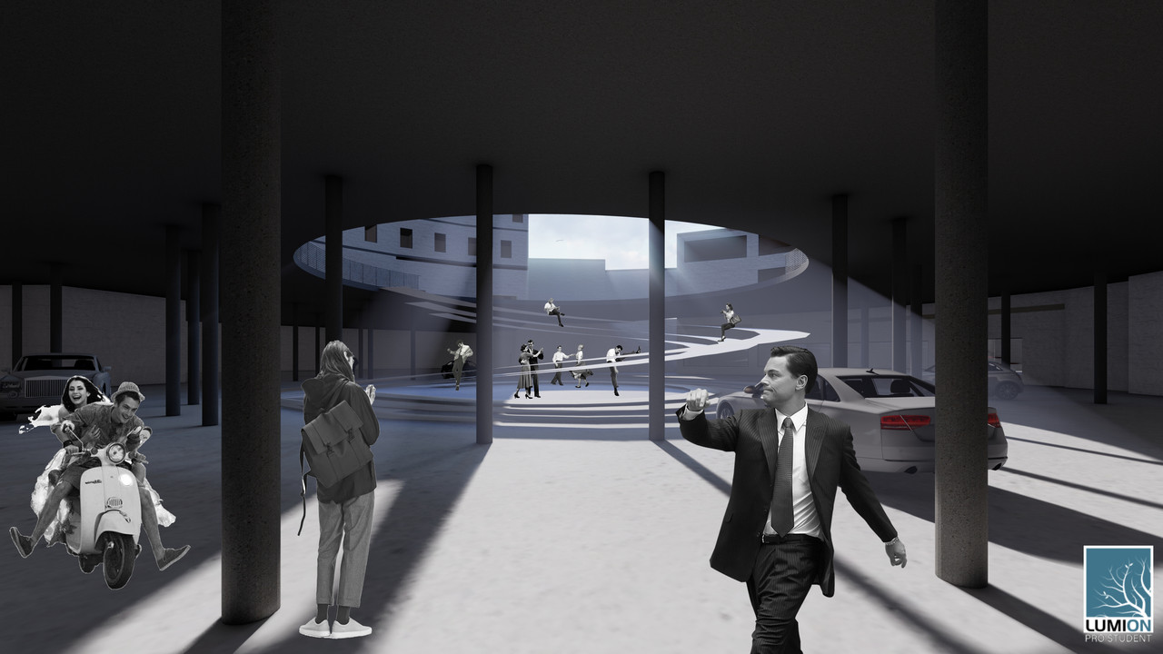 An initial concept of a spaceship with a cylindrical form started the ball rolling. A “spaceship” in a sense where everything a person needs/wants is within the compounds of the site, creating this community/neighbourhood like environment that encapsulates education, recreation, culture and commercial aspects of the population. A stark and monolithic front is contrasted and complimented by a central open plaza, that is the heart and core of the site. Surrounded by buildings, the central plaza transforms into a public interior where people are out in the open but feel like they are inside. Sticking out like a sore thumb this dynamic transformation seeks to create an interaction between architecture and landscape, inside and outside, and rather than an addition of a mass with the same architectural language, this new form exist as a complimentary contrast to the existing.