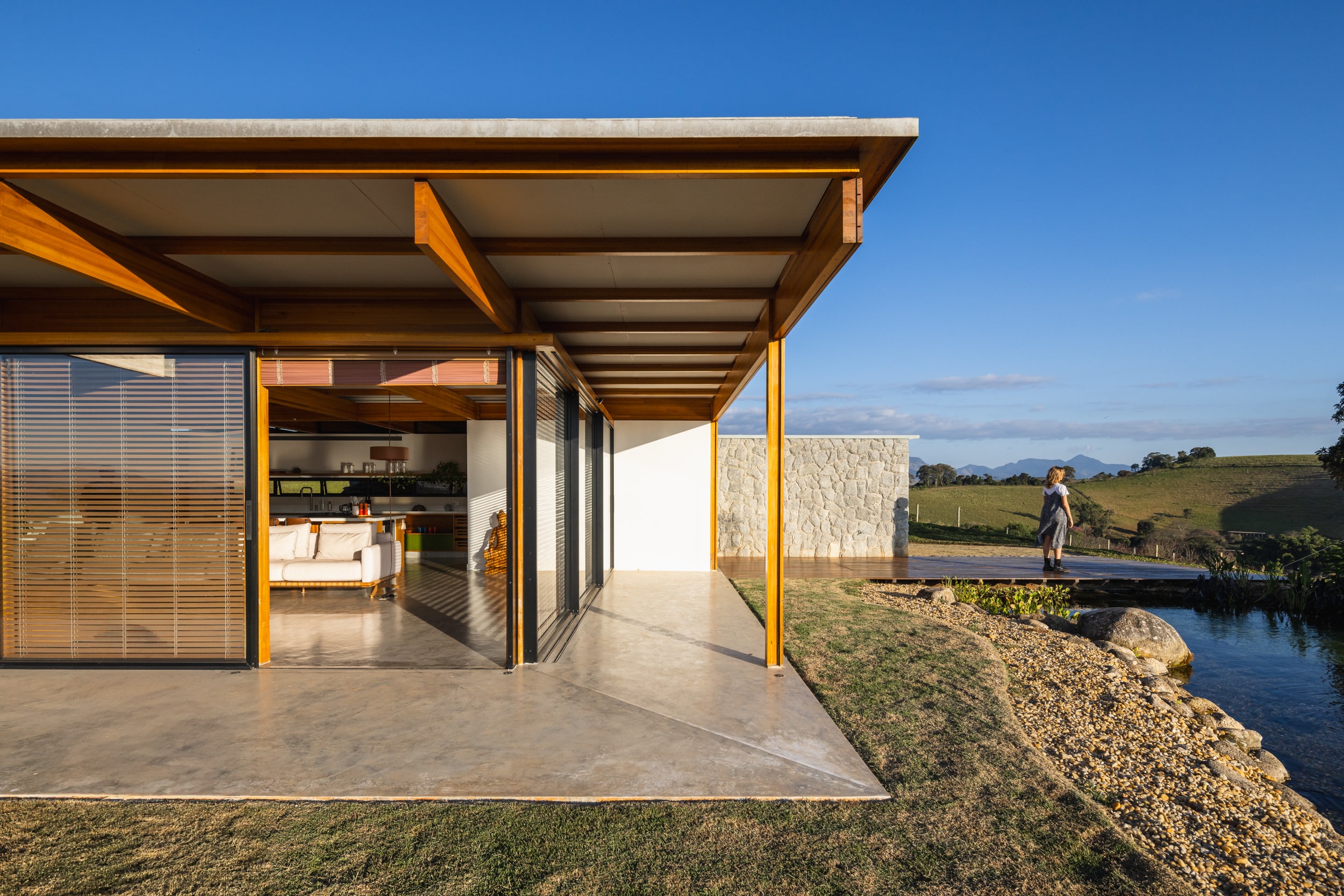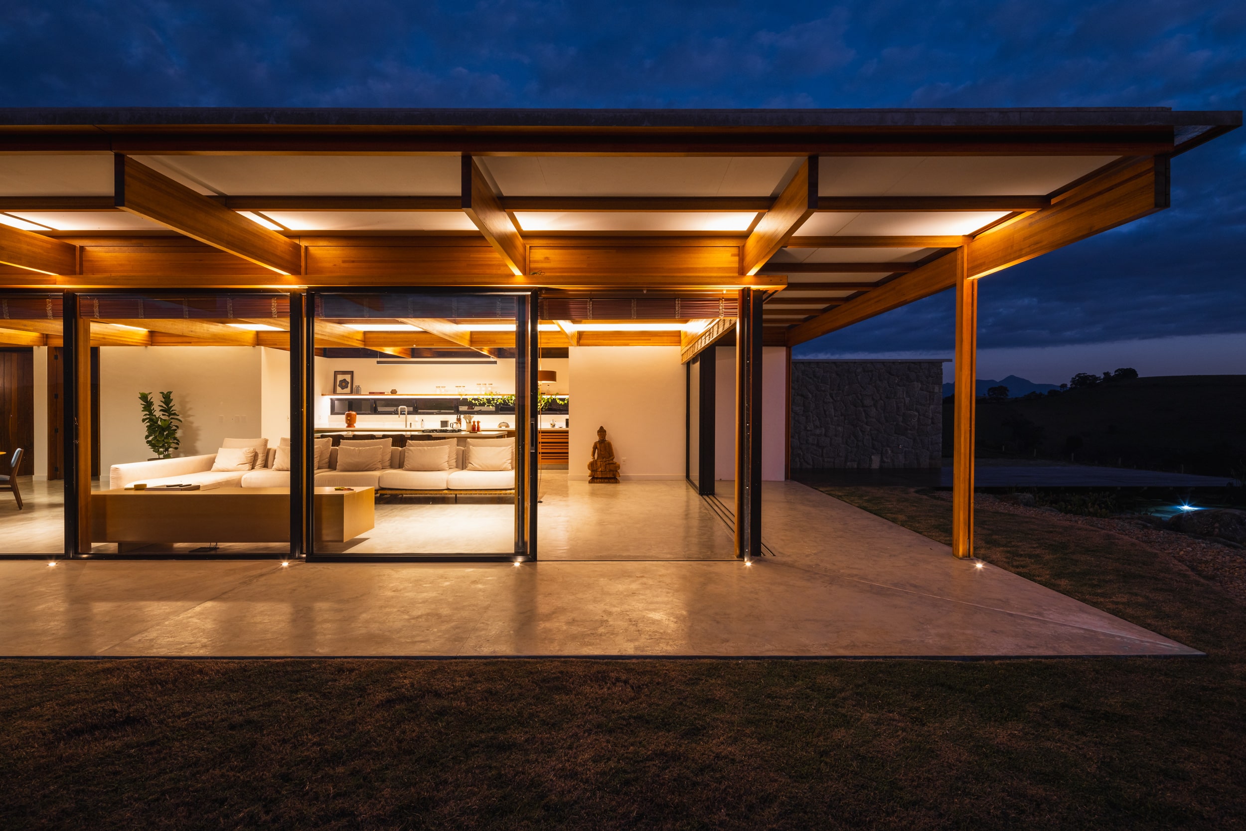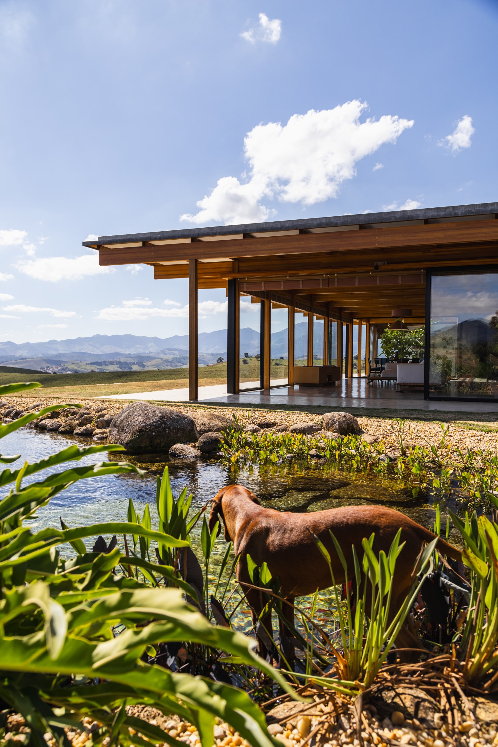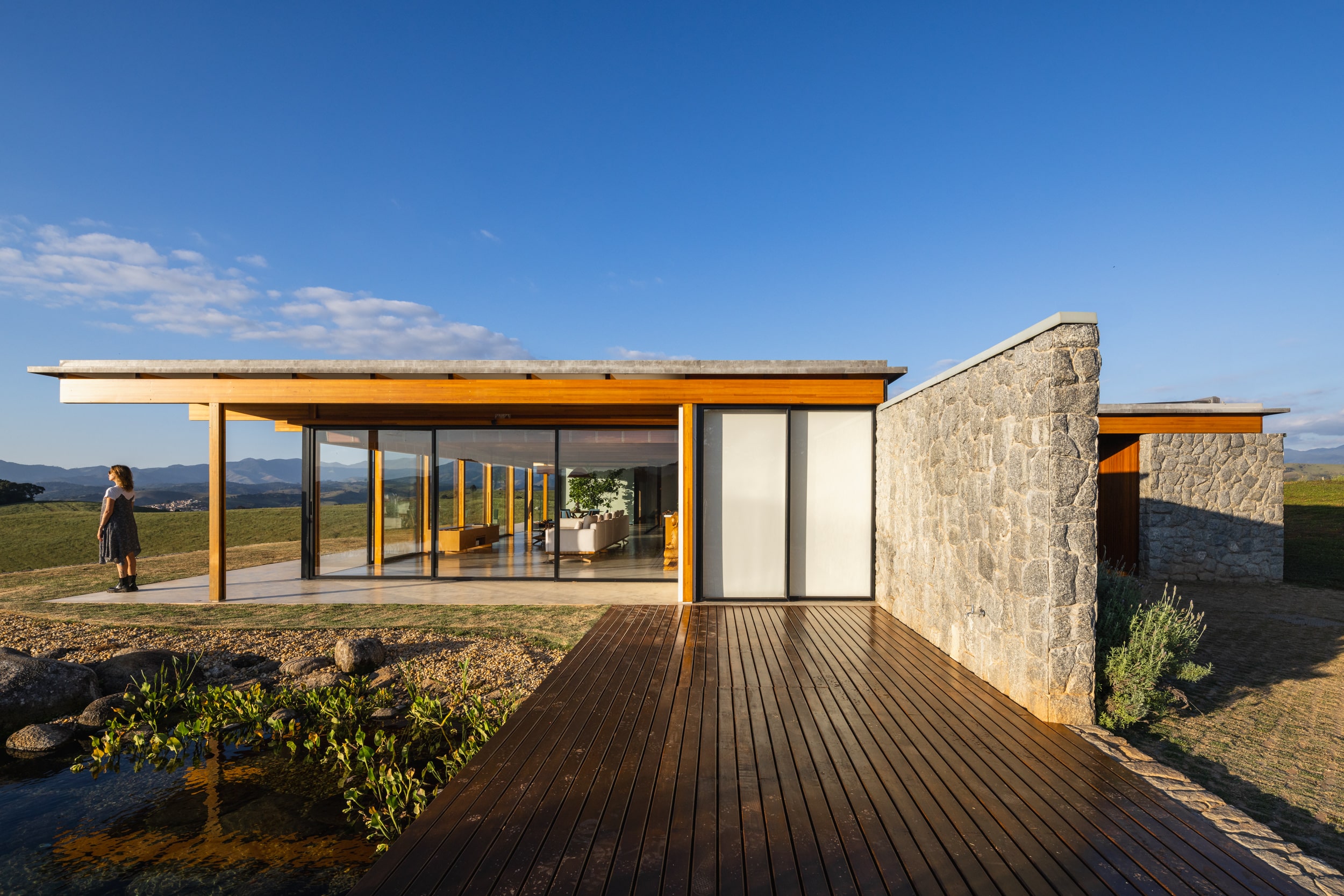 With 280 m², Casa Minas, designed by the firm Sabella Arquitetura, combines wood structure, stone walls, and large glass panels to create a warm and welcoming retreat in southern Minas Gerais.