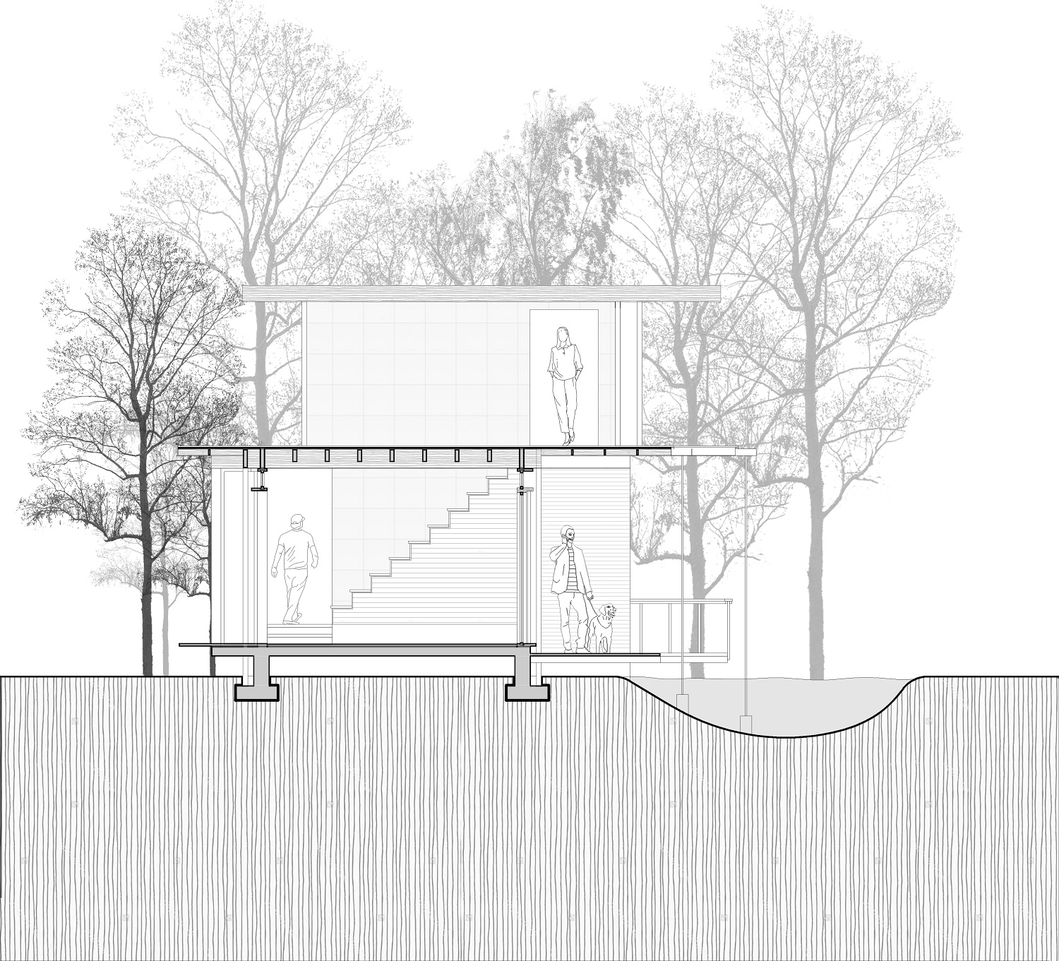 To escape from the metropolitan hubbub, the cabin house has been designed in a manner that it inserts itself into the flora and fauna of a formulated microhabitat and acts as a burrow within a fast paced city. It envisions to bring back a laid back lifestyle for the nature enthusiast- retired clients. With a footprint that consumes only 8% of the plot area, the cabin preserves the existing trees, provides an opportunity to grow a personal nursey, and house a 40 sq. mt. self-sustaining eco- water body.