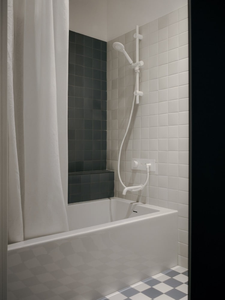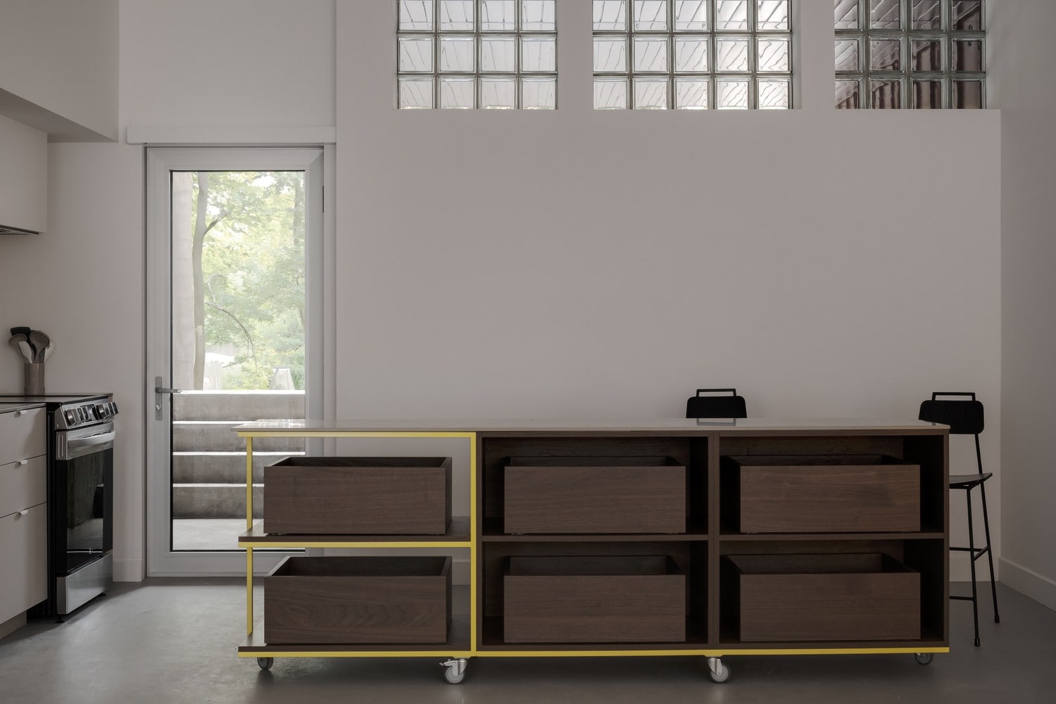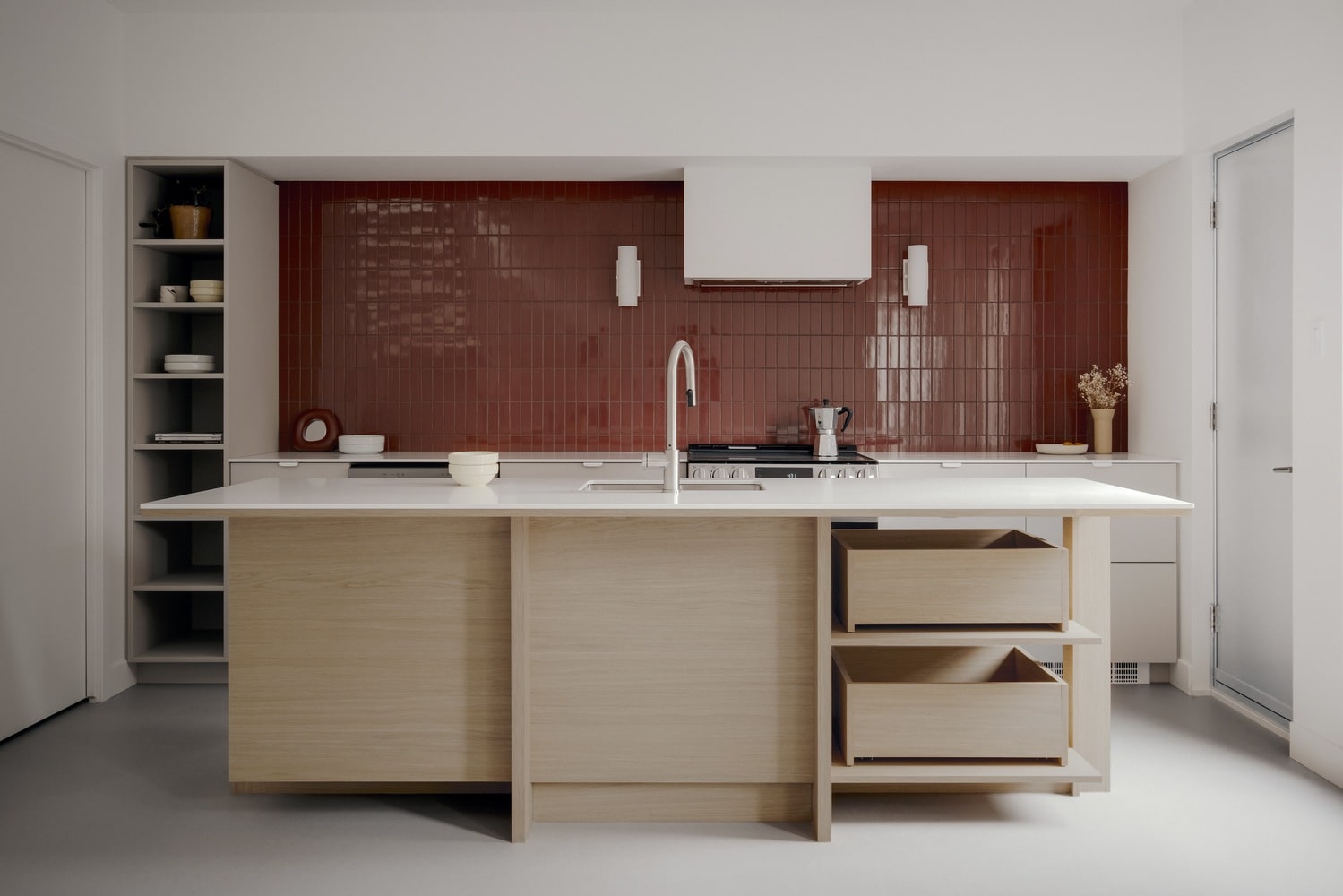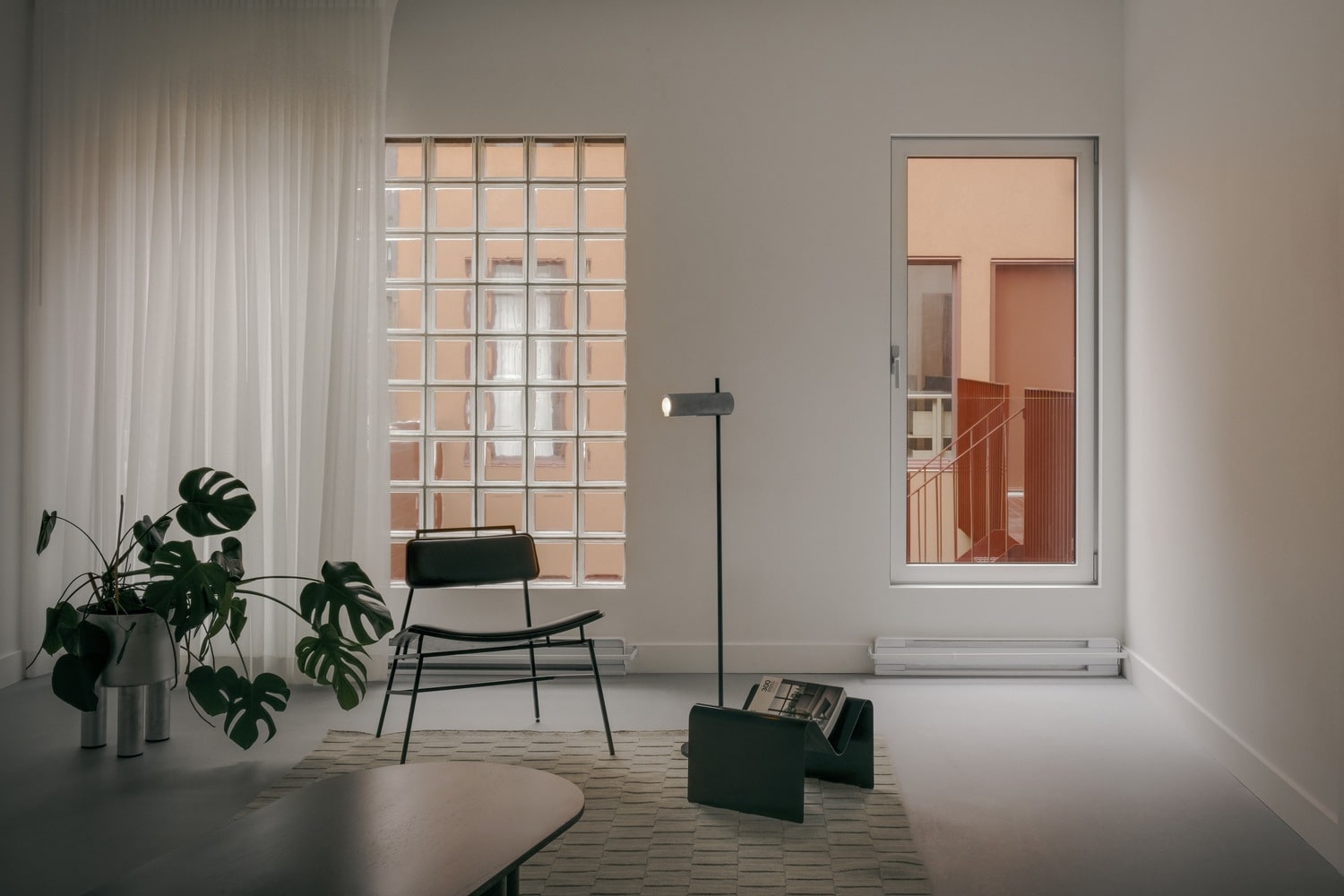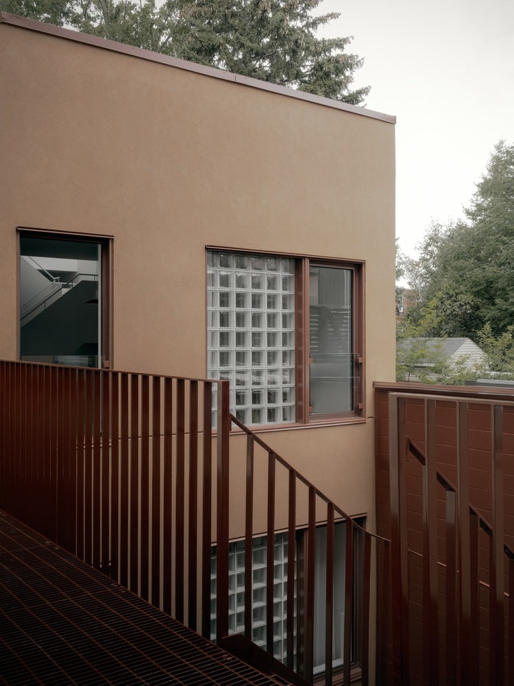 Inside, the design is equally meticulous. Material choices and color palettes shift from unit to unit, reflecting the residents’ personalities while maintaining a coherent aesthetic. Finely crafted custom kitchen islands, diverse bathroom ceramics, and thoughtfully framed windows ensure every home feels bespoke. The courtyard’s glass block walls diffuse soft light, protecting privacy while enhancing brightness in shared zones. The double-height red base enlivens the heart of the project, connecting all spaces through a warm visual language.