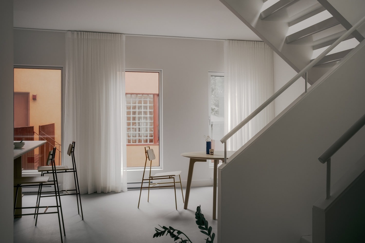 Binôme includes five individual residences: three open-plan units of roughly 600 sq. ft. and two duplexes of about 1,500 sq. ft. Each home has its own entrance, ensuring a sense of autonomy while still belonging to a shared environment. Access is either through the courtyard or via a private passage opening onto rear terraces, offering varied spatial experiences.