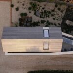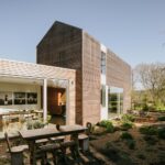 The first floor is dedicated entirely to a new master suite, where the vaulted ceiling follows the geometry of the roof. Concealed lighting, built-in furniture, and a full-width picture window combine to create a serene retreat that celebrates the surrounding landscape. At ground level, the new kitchen and dining space opens directly onto a kitchen garden planted with drought-resistant herbs and perennials, strengthening the relationship between interior living and outdoor cultivation.