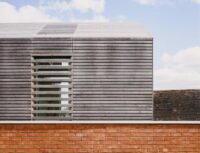In the master bedroom, privacy is negotiated through a pair of interwoven sliding larch shutters. These movable screens allow occupants to adjust views and light levels throughout the day, offering moments of openness or enclosure depending on need. This dynamic façade element not only satisfies planning requirements but also introduces a playful, tactile quality to daily use.