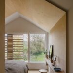 Inside, the extension is defined by a warm, cohesive material palette. Birch plywood is used extensively for bespoke joinery, including the kitchen, staircase, wardrobes, bathroom fittings, bedhead, and integrated furniture. This material continuity lends the interior a calm, crafted atmosphere while reinforcing the barn-like character of the architecture.