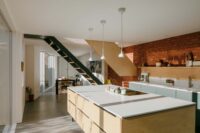 Local planning restrictions limited window openings overlooking the bridleway, prompting a thoughtful response that turned constraint into opportunity. The architects introduced a glazed vertical slot housing the new staircase, bringing daylight deep into the plan while maintaining privacy through a fixed timber screen composed of hit-and-miss slats.