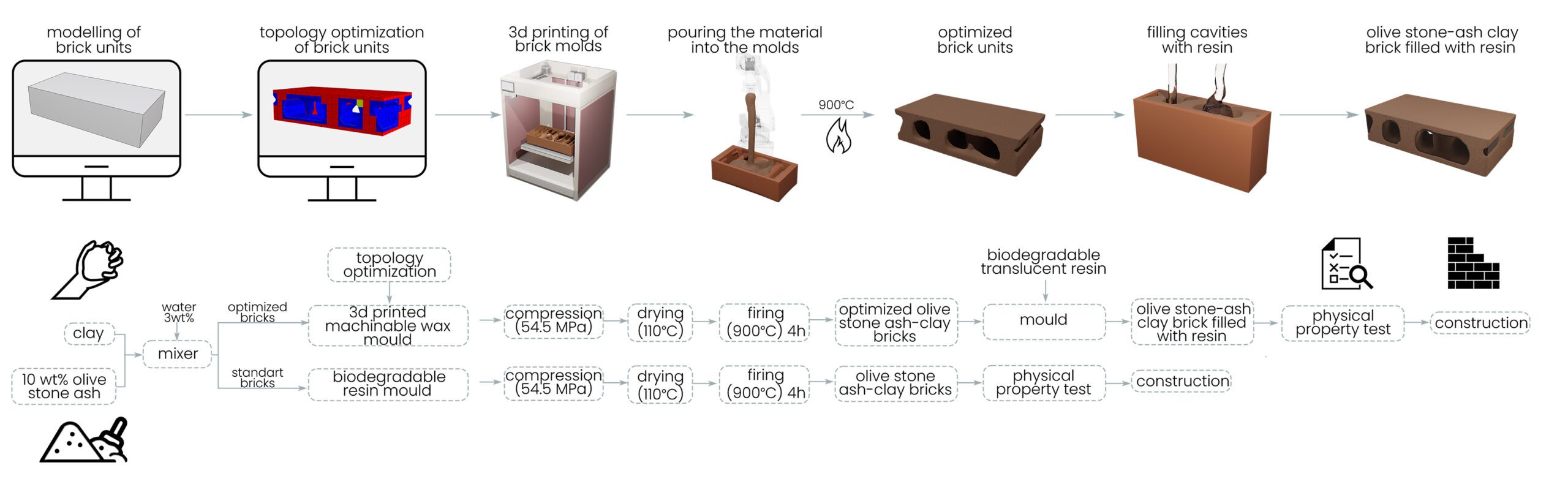 To combine with olive ash clay brick system with optimized brick units, it should be filled with a material to prevent wind, rain and other influences to the building. We are proposing to use biodegradable resin which is increased of usage in architectural project with flexible usage areas. It enables to create the sunlight illusions through the day because of our optimized bricks have different cavities. Lastly, we have seen that there are huge material use and solar radiation differences between standard bricks and optimized bricks. With optimized bricks proposal, it is almost 30 m3 less material used. In conclusion, we believe that the proposed system is a successful circular economy system with the steps of design, production, remanufacturing, consumption and waste management.