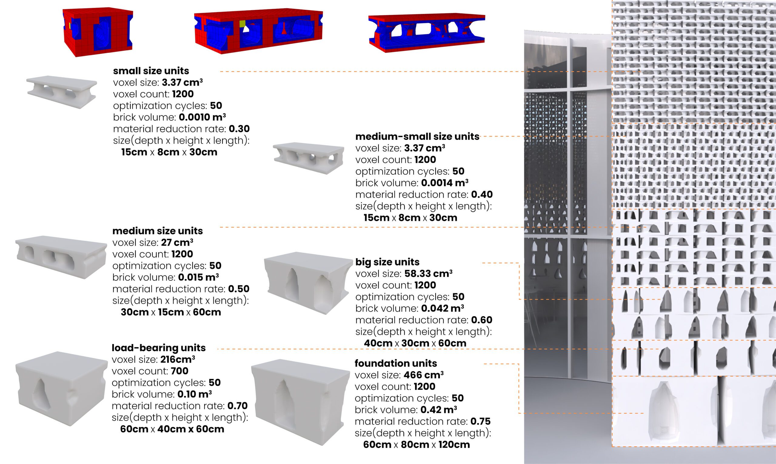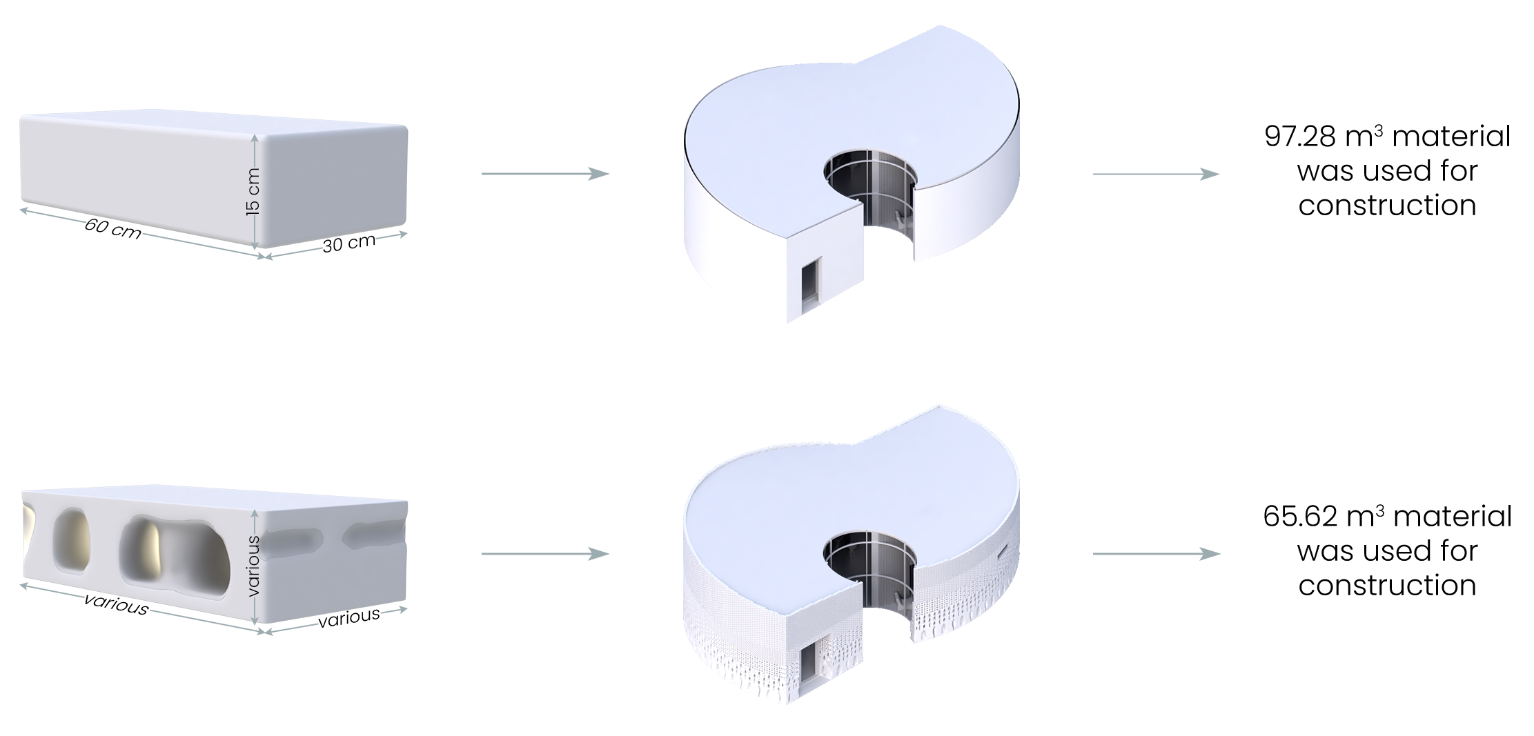 In our latest researches, we found a material called Pomastic is a kind of biodegradable plastic that doesn’t damage the environment and also it is recyclable material. As it’s written in the Spirala Community Home Brief, the form of the building is preferred in a round shape, so we offer a form which is going to be constructed with the traditional masonry technique. With topological optimization of the masonry units, it has been proposed to have different types of optimized bricks which meets the different strengths.