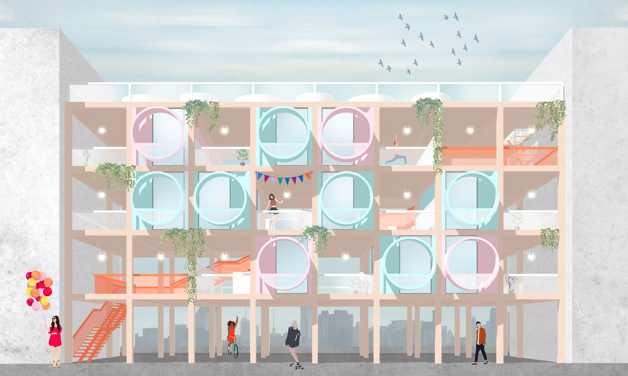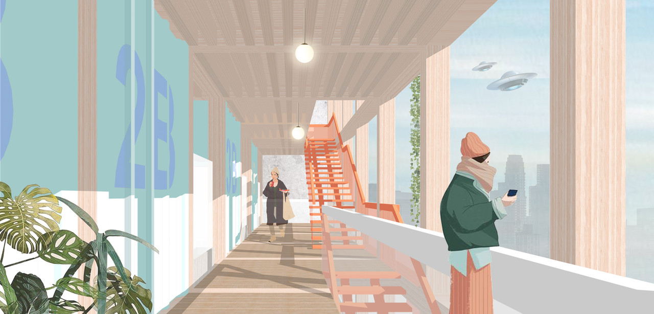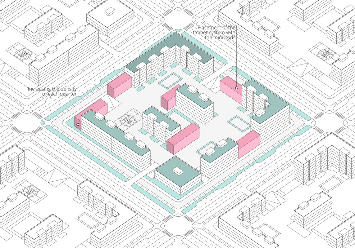 More young people will move to the big cities to study or work and the demand for the cheap mini housing will grow. However, this kind of apartments should have all the necessary things to make comfortable the life of a person at the beginning of the career. We propose to use the old sea containers as the transformer living minimodules. There will be organized a fully equipped bathroom, kitchen, bedroom and the working space. The modules will be placed into a timber-frame structure that will become a solid urban unit. Such structures will fill empty spaces in the unfilled urban grid, for example between the houses or on the rooftop. This approach will help to increase the density and create the new type of an affordable housing. In addition, the life rhythm becomes faster and the migration inside the future city should become easier. For this task the mini living cell is convenient to transport to a new location.