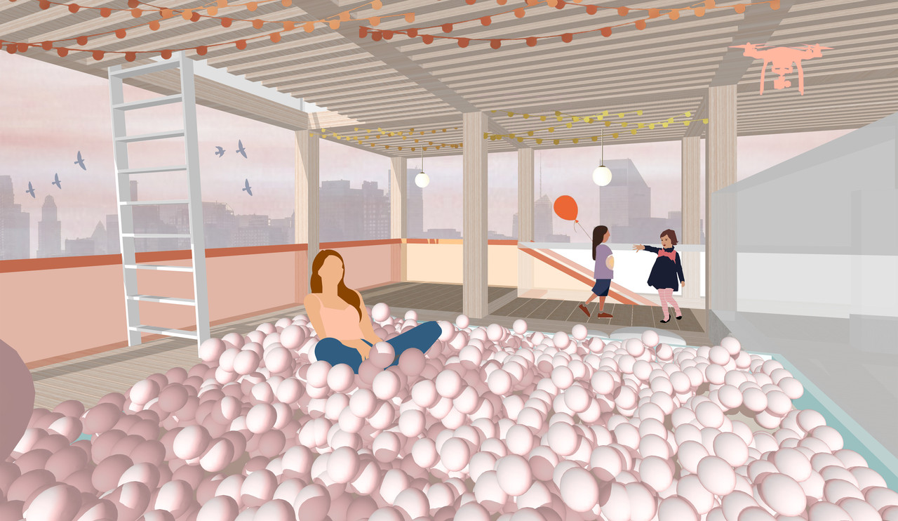 systems are connected with the owner’s phone. The bath is provided with the system of an effective water using. On the roof of the timber structure the tanks for collecting the rainwater are installed and connected with the cell’s water supply system. Solar panels help this structure to become absolutely autonomous. Also the timber construction may act as a vertical garden. It let habitants to grow different climbing plants, which will help to depollute the surrounding environment by filtering dust particles from the air and absorbing carbon dioxide. Each mini module has a terrace, where it is possible to cultivate food plants or if open the window and expand the table, make a party outside. Thus the private space of the mini house can become public. There is also a common area on the highest level of each building where all the habitants may come together and communicate. The mini unit has access to the round balcony which can also be used as a place for the drone delivery.