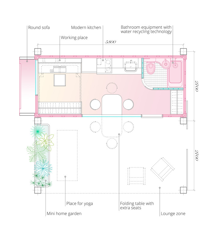 The mini living module is friendly to the environment, totally made of recycled materials and equipped with the latest technological devices. All the electrical