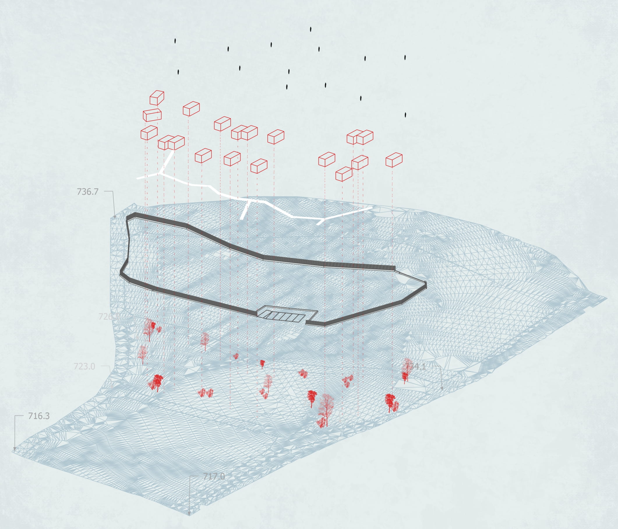 To accomplish this task, the project zones were organized by allocating meeting areas: three main gathering points were designed for the upper, lower and intermediate levels of the territory, which are connected by a wooden path (the same wooden path leads from the parking zones to the gathering points).