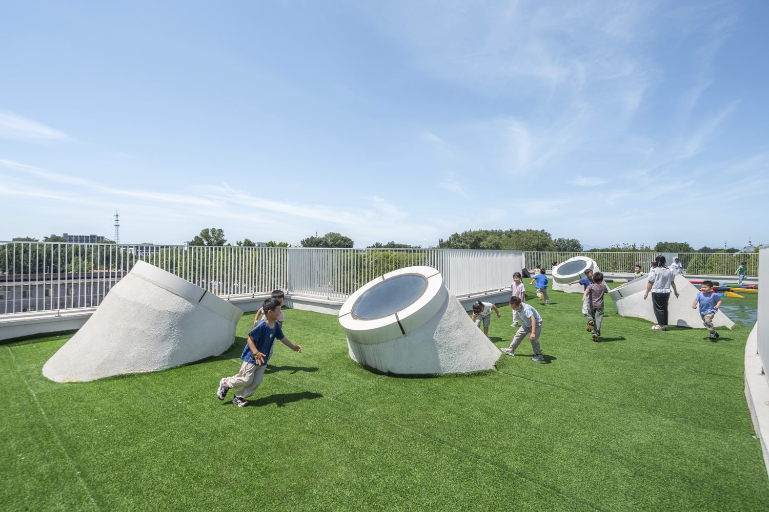 Lightwells punctuate the roofscape, filtering sunlight into the spaces below while offering sculptural elements that encourage climbing and tactile engagement. These undulating forms enhance the roof’s visual dynamism, transforming it into both a functional play area and a poetic spatial gesture that embodies the concept of “running toward the sky.”