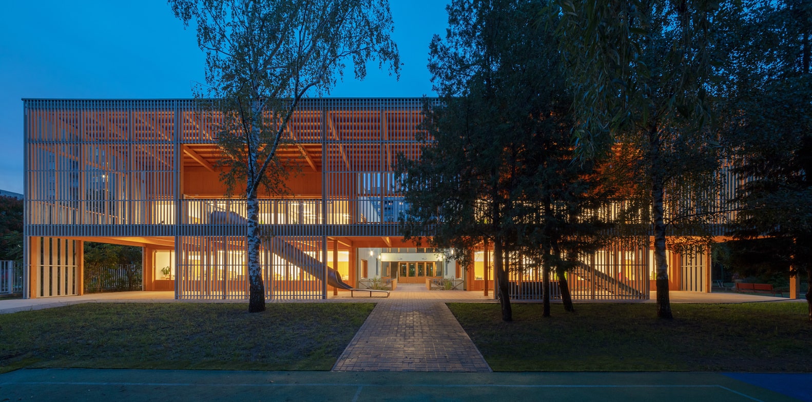 On the exterior, the redesign intentionally sets the kindergarten apart from its monotonous surroundings. Large openings, wooden windows, and a newly introduced color palette break away from the dominant gray tones of the neighboring prefabricated towers.