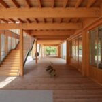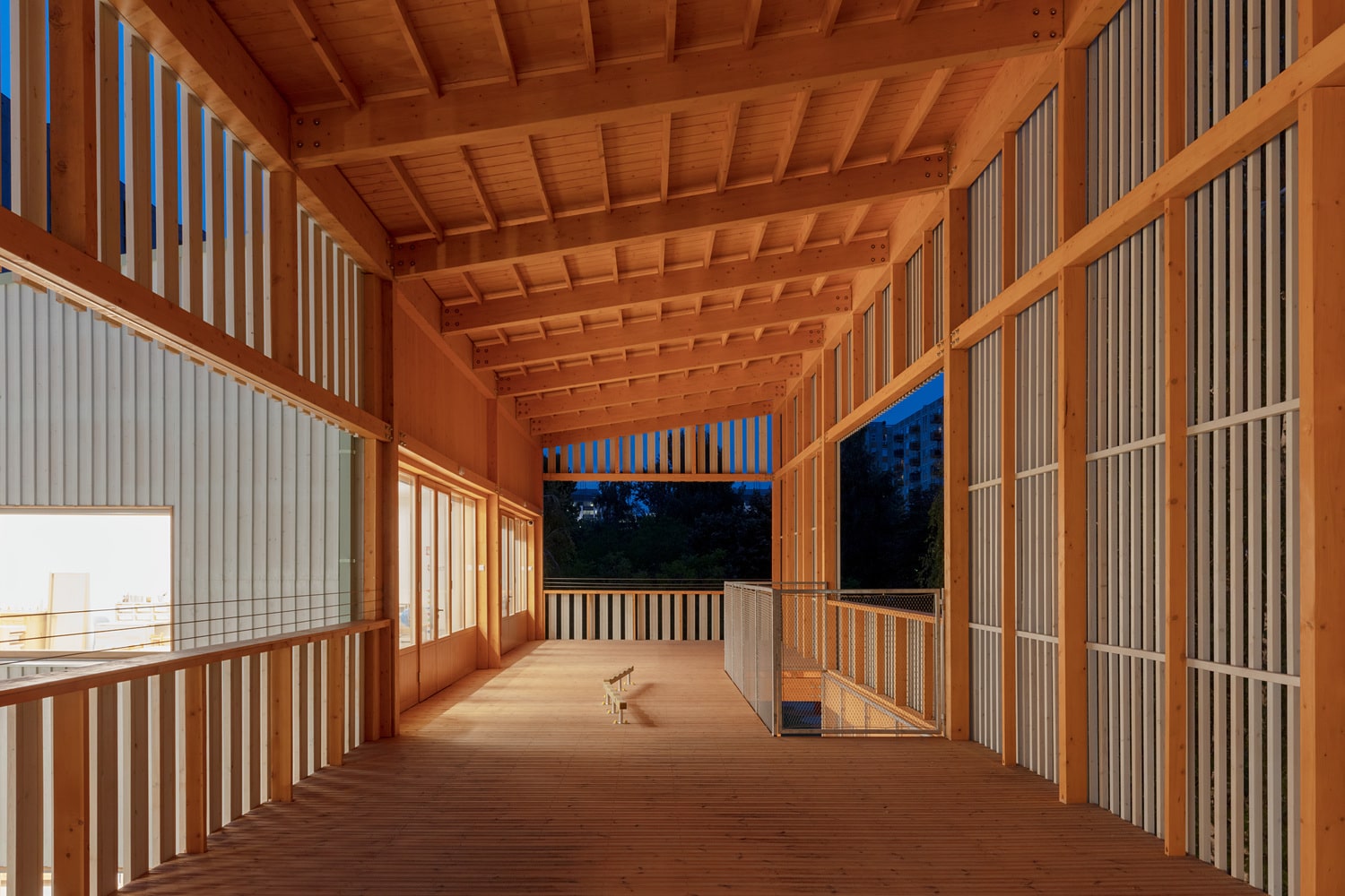 Inside, the strict and restrained character of the existing concrete structure is carefully softened through the extensive use of wooden finishes. Openings, built-in furniture, handrails, and accents introduce warmth and tactility, creating a calm and friendly atmosphere suited to young children.