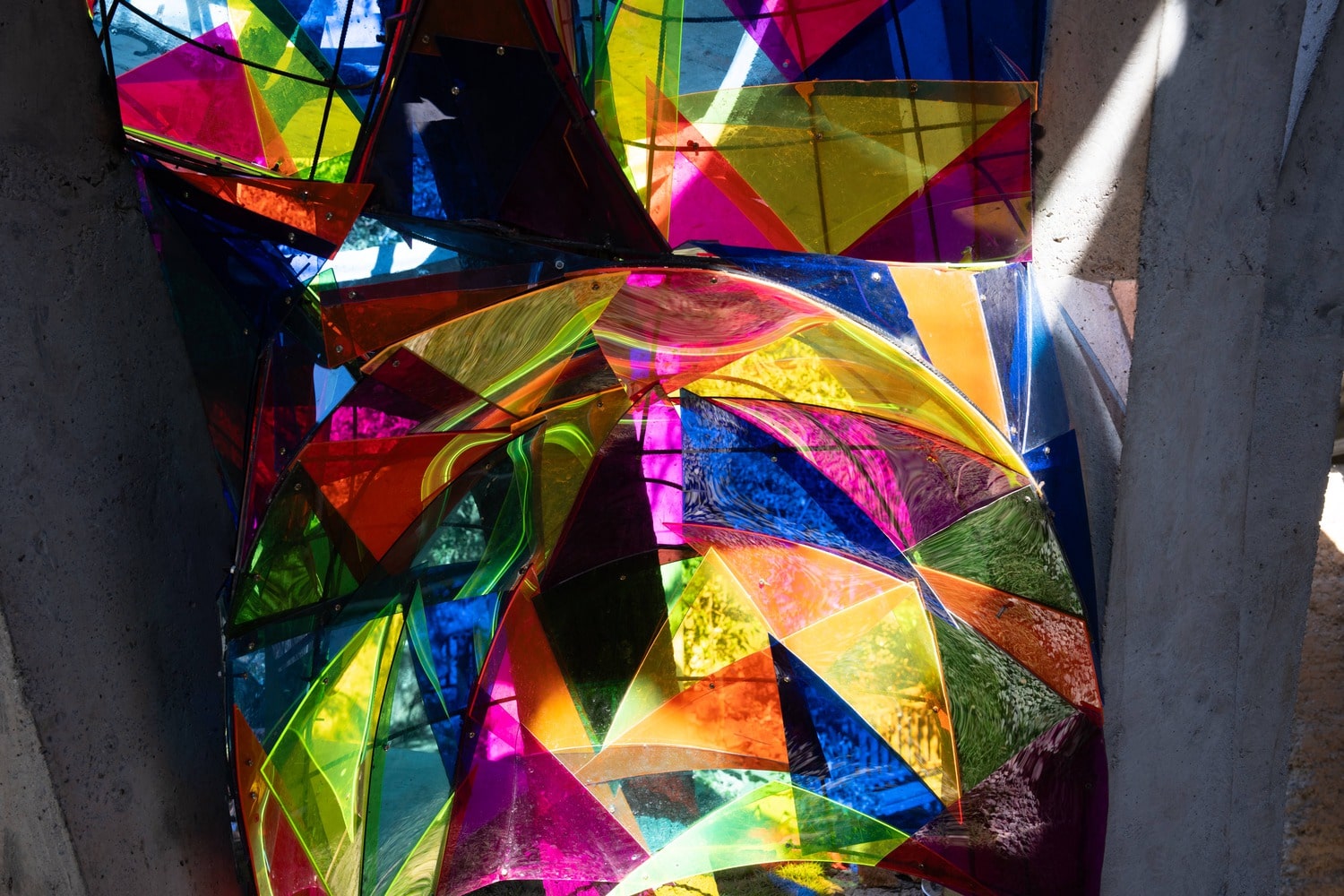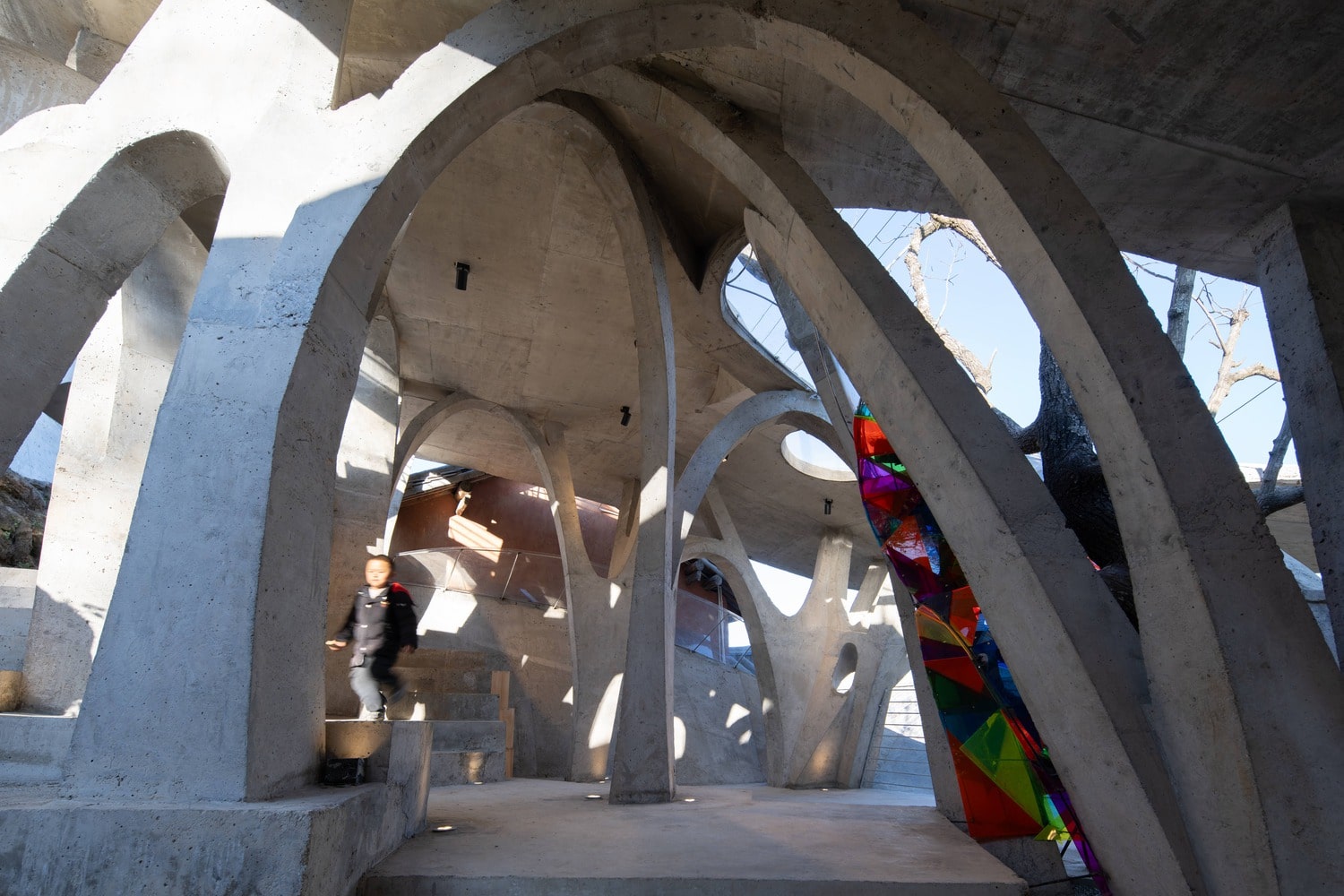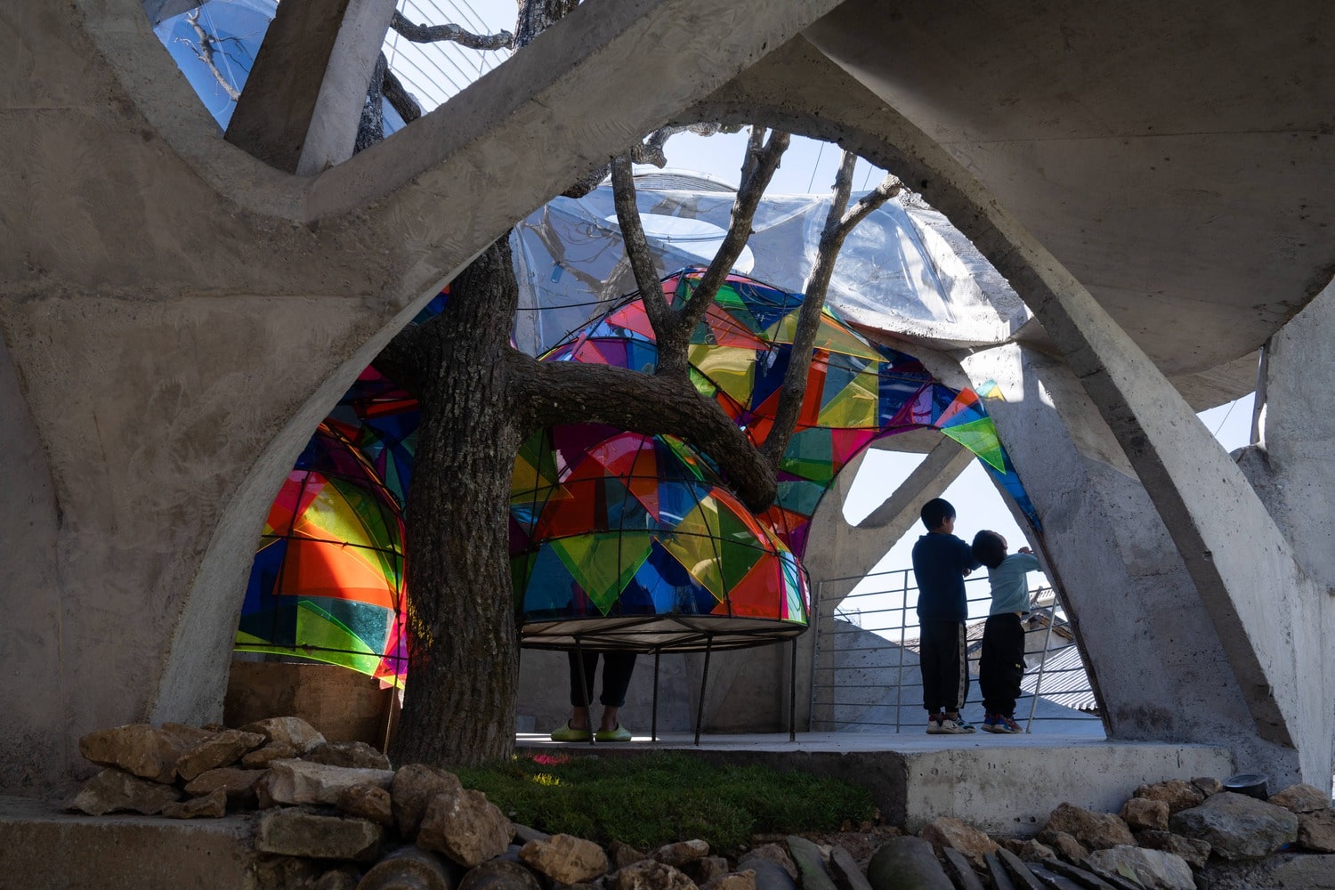 Natural light is treated as a central element, animating the interior through a series of openings, including a central oculus, stair voids, and preserved tree hollows. Arched steel columns cast dendritic shadows, while semi-spherical bookshelves, woven from steel rods and clad in translucent colored acrylic panels, scatter kaleidoscopic reflections throughout the space. Curved, sloped walls double as seating, turning the library into a “living theater” where children can observe the movement of light and shadow throughout the day.
