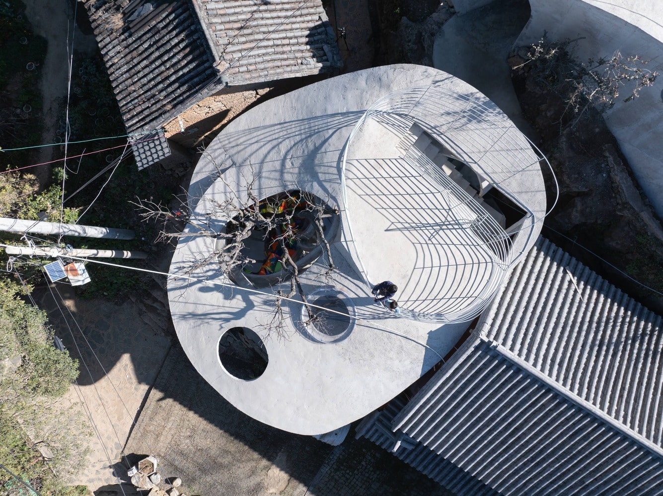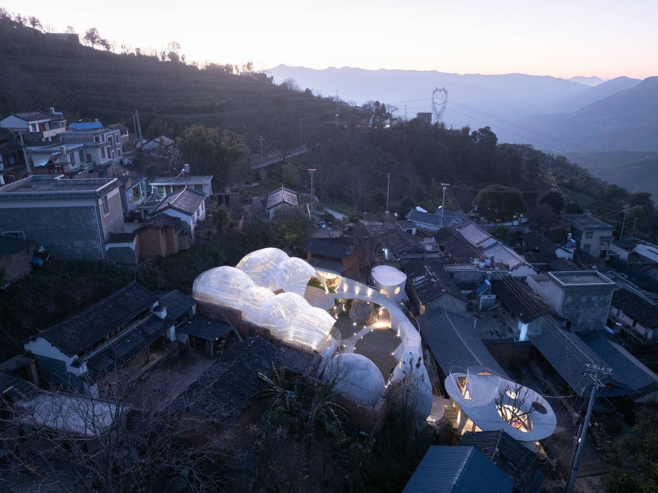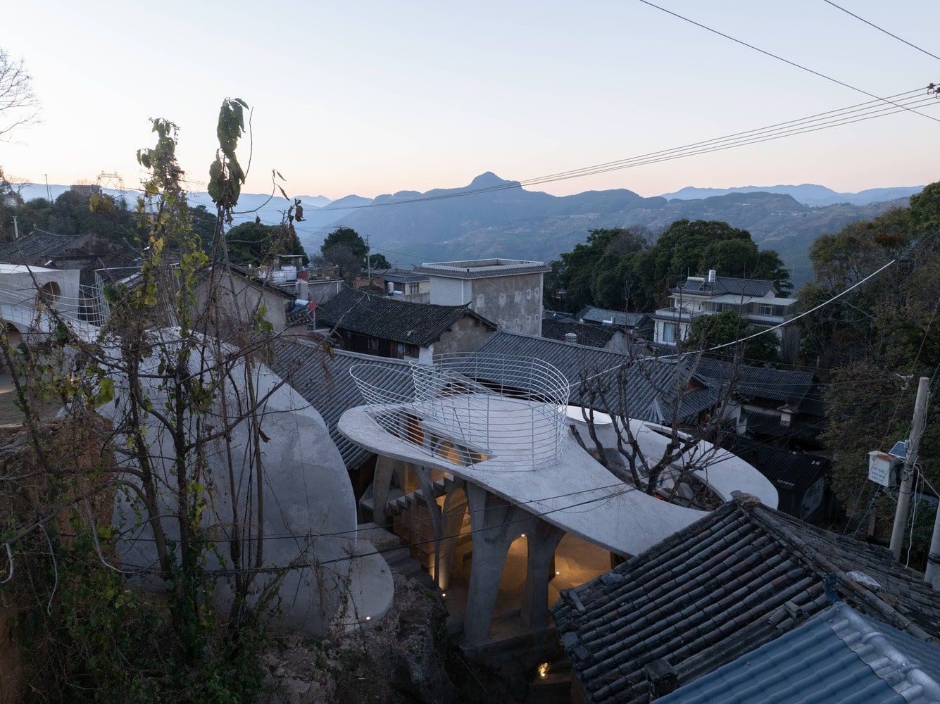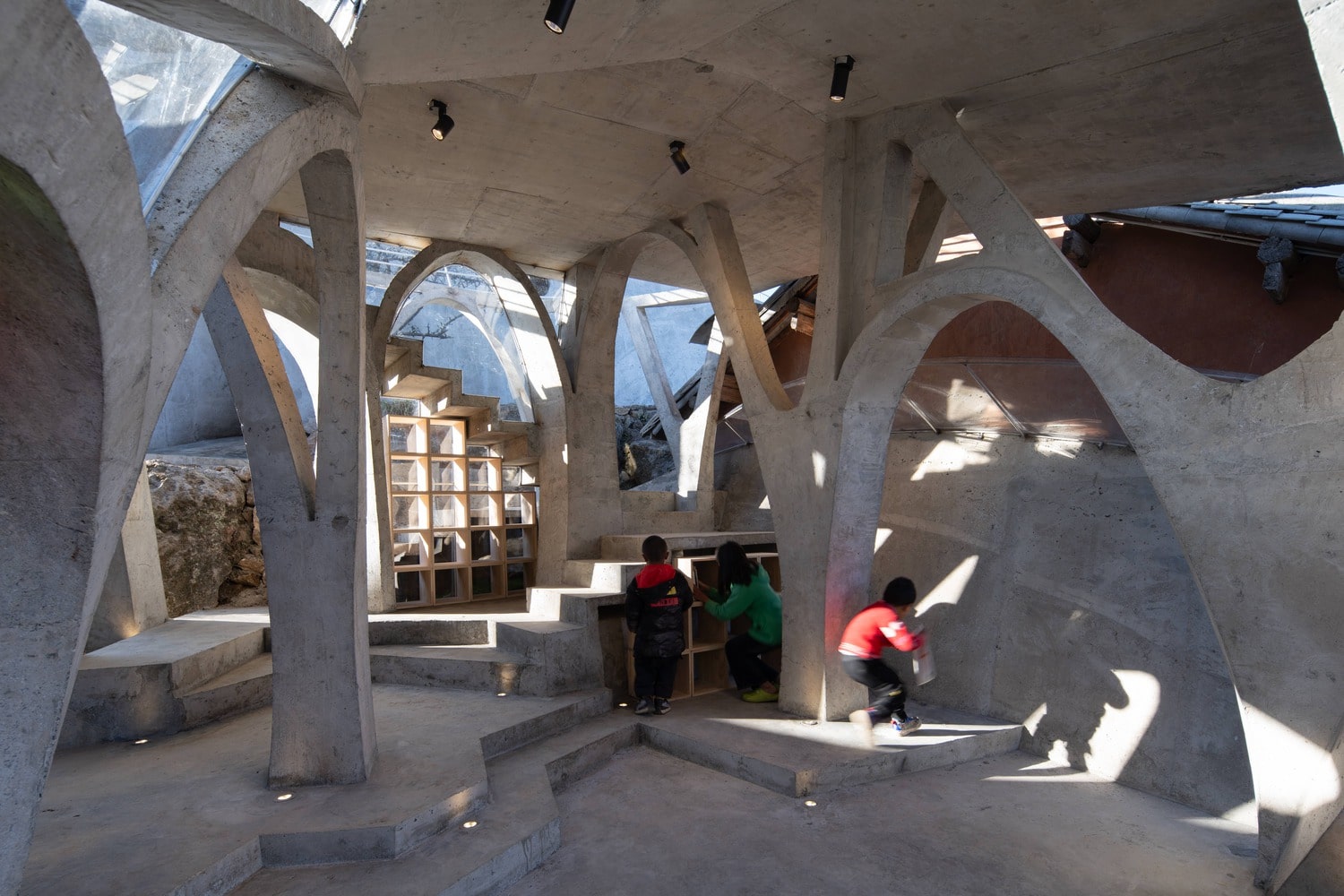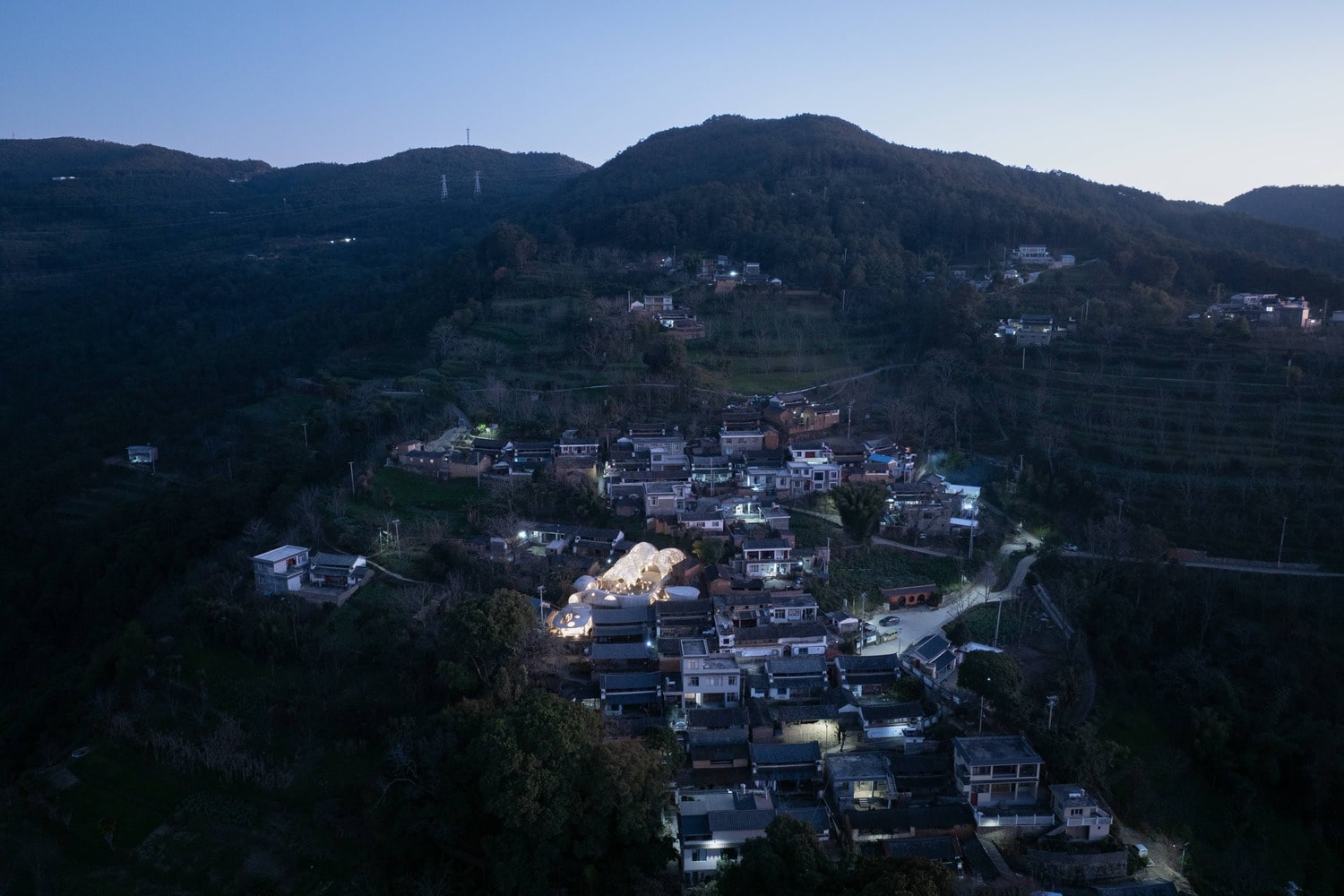 Nestled in the remote folds of the Wuliang Mountains, Yanzitou Village is home to six ethnic groups and just 71 households. The village faces the challenges of depopulation and aging residents, yet weekends bring life as children return from town schools, filling the plaza near the village history museum with energy and laughter. Situated on a narrow rocky plot between two historic dwellings and shaded by a sprawling raisin tree, the Mushroom Library serves as both a cultural gateway and a catalyst for rural rejuvenation. It embodies the potential of architecture to foster education, play, and intergenerational connection in a fragile rural context.