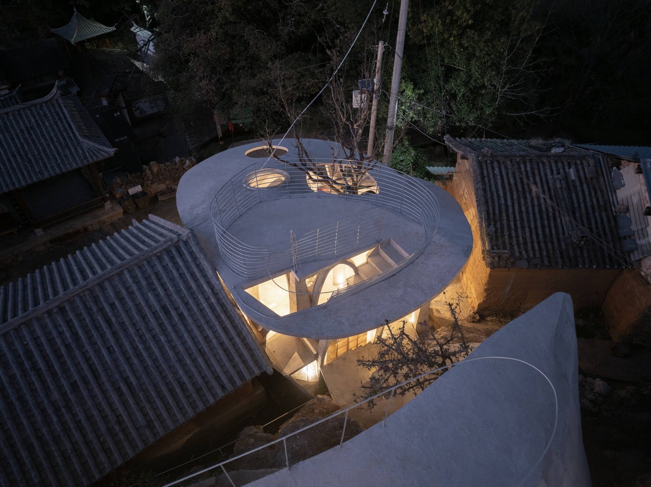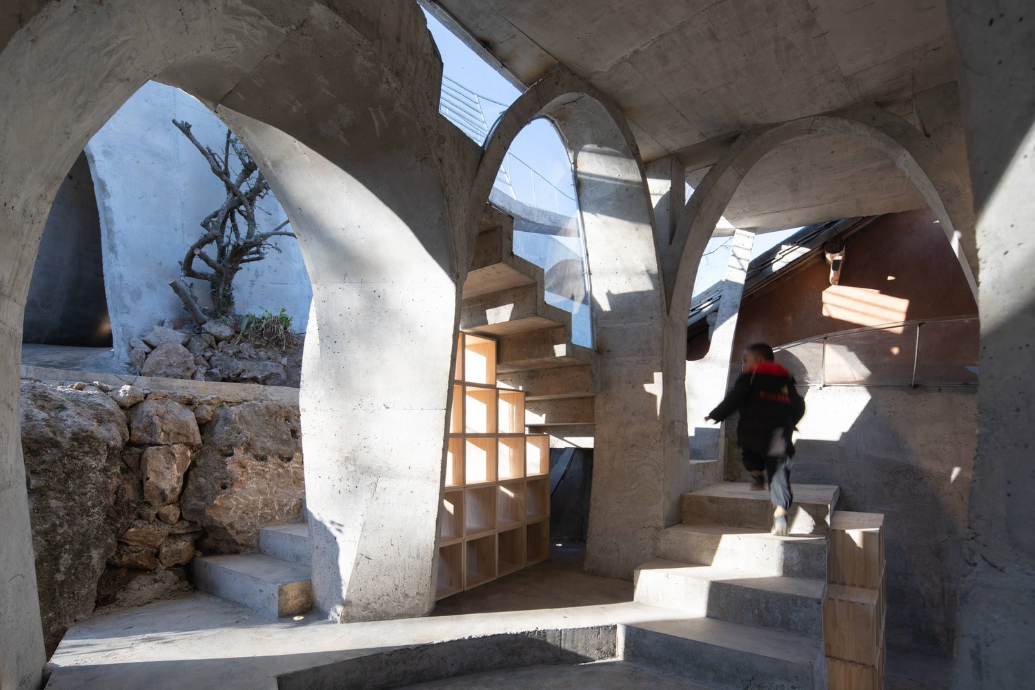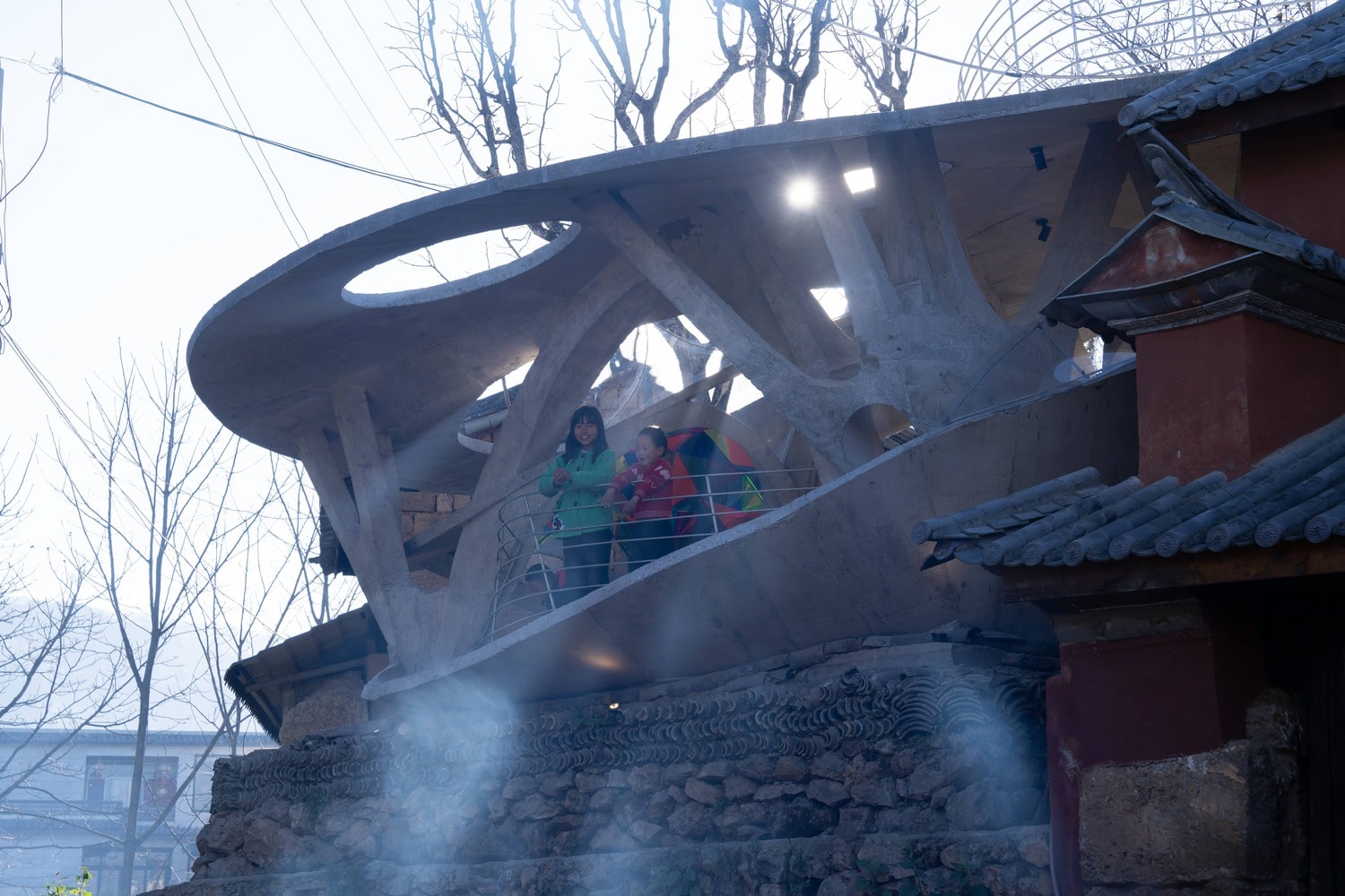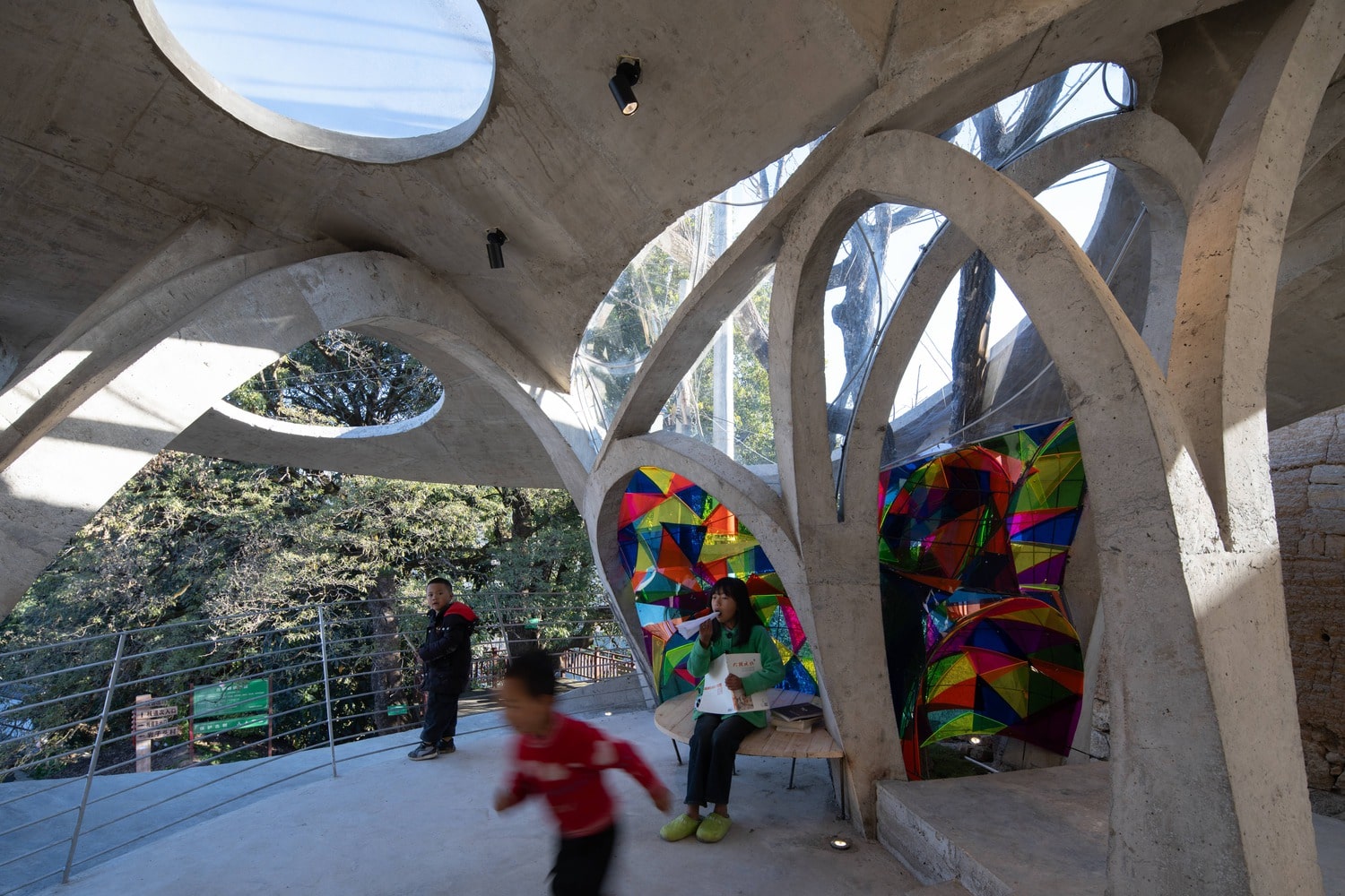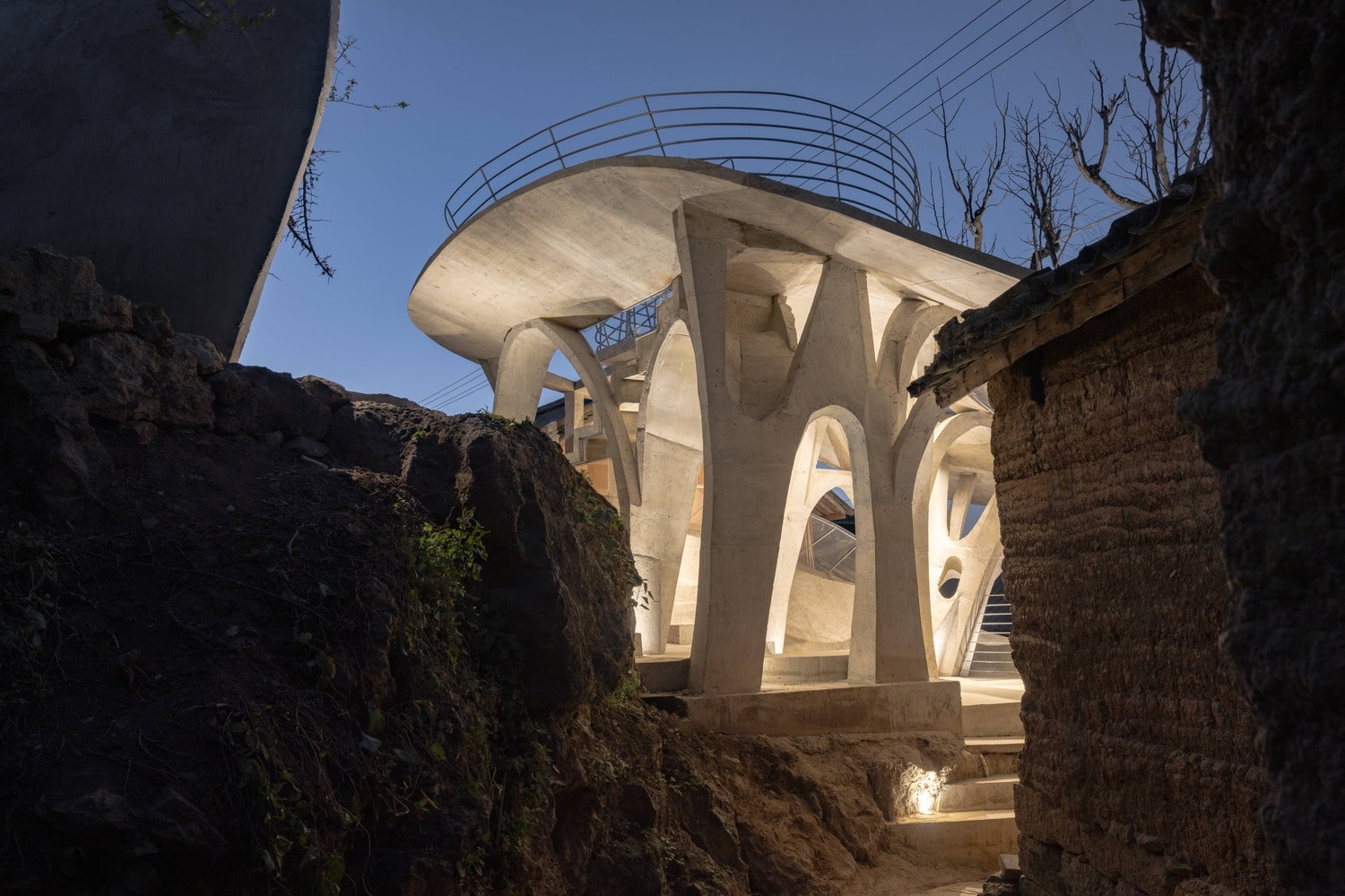 Nestled in the remote folds of the Wuliang Mountains, Yanzitou Village is home to six ethnic groups and just 71 households. The village faces the challenges of depopulation and aging residents, yet weekends bring life as children return from town schools, filling the plaza near the village history museum with energy and laughter. Situated on a narrow rocky plot between two historic dwellings and shaded by a sprawling raisin tree, the Mushroom Library serves as both a cultural gateway and a catalyst for rural rejuvenation. It embodies the potential of architecture to foster education, play, and intergenerational connection in a fragile rural context.
