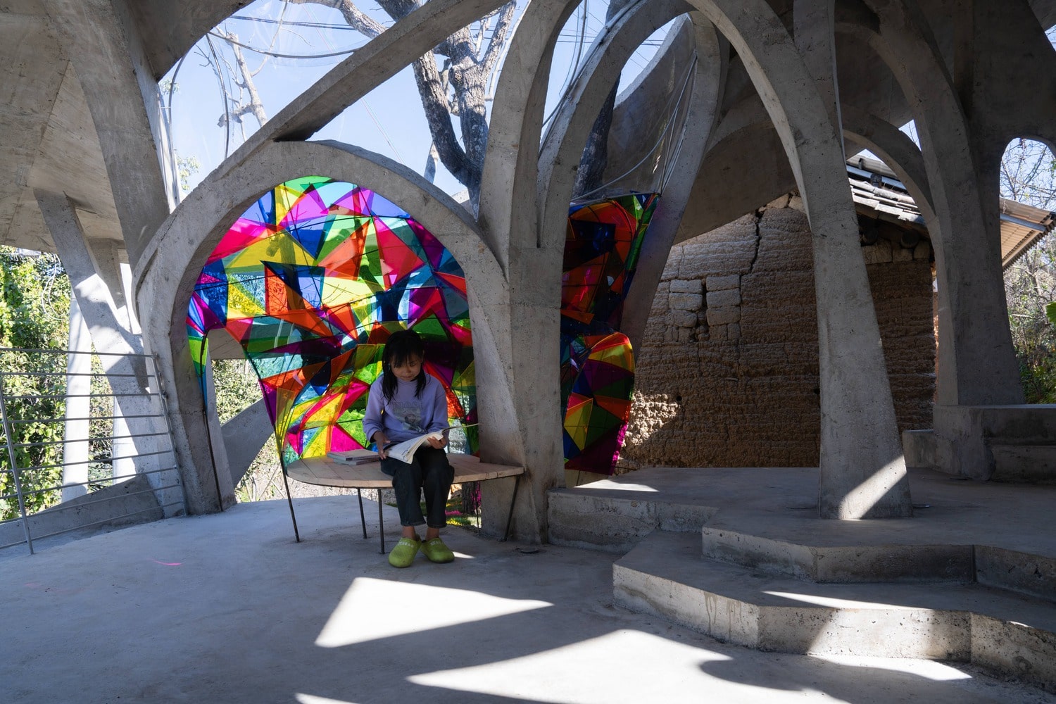 The library’s design is guided by an improvisational, site-responsive approach. Collaborating with local artisans, 12mm ribbed steel bars were woven into branch-like arches cantilevering from the roof, forming a dual canopy that interacts with the raisin tree’s crown. The overlapping circular roofs, reminiscent of native mushrooms, lend the building a playful, symbolic identity. Cast-in-place concrete vaults replace traditional thatch-and-earth materials, offering durability while evoking the elemental simplicity of early shelters.