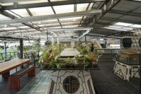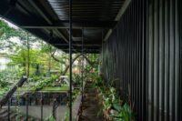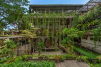 Above, the Sky Office floats over the building — an open-plan studio space for Realrich Architecture Workshop. This rooftop level is both a workplace and a landscape, with orchid gardens, views toward the chicken coop, and glimpses of the Jakarta skyline. The sky garden hosts a micro-ecology with goats, tortoises, lizards, guinea pigs, and chickens, creating a closed-loop system where animal waste becomes compost to fertilize the rooftop gardens.