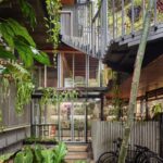 Kampoong Guha is more than a building complex — it is a living experiment in architecture, education, and communal life. Designed by Realrich Architecture Workshop, the project brings together a diverse program under one roof: the OMAH Library (a public and children’s library), the RAW architecture studio, co-working spaces, a workshop hall, home education classrooms, boarding rooms for students and young designers, and the private residence of the principal architect. The name “Kampoong Guha” references the idea of a “village of caves,” an intricate, interwoven habitat that reflects Jakarta’s complex urban fabric and the need for resilient, multifunctional spaces.