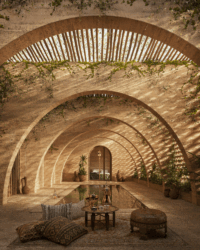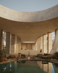 Rammed-earth walls crafted with desert sand draw upon the region’s ancestral building techniques and are combined with contemporary elements such as carved-pigmented concrete. Each structure is elevated on a raised platform, protecting it from the effects of the weather and enhancing its presence within the landscape. These earthen structures provide natural thermal insulation against the desert’s intense heat while maintaining a low environmental footprint. The intention is to innovate through tradition, preserving the past while envisioning a sustainable future.