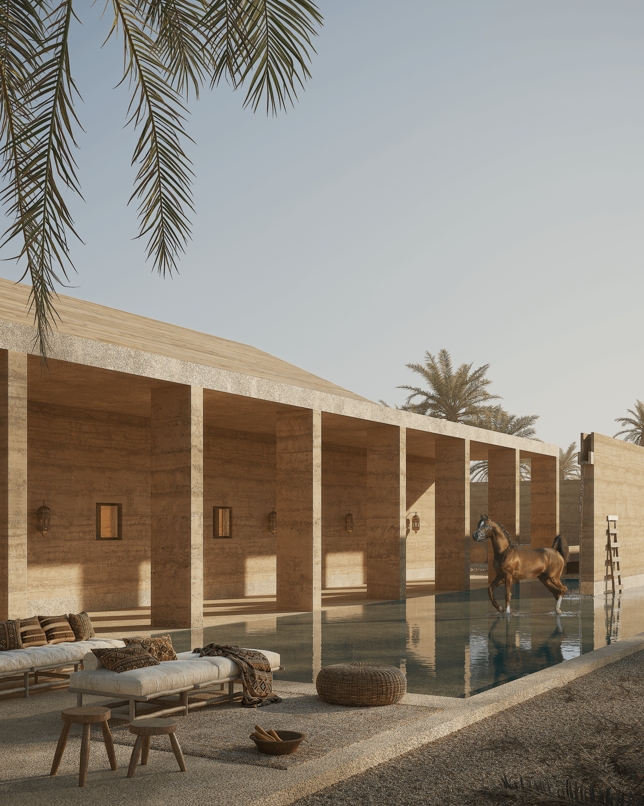 The project integrates into a sustainable date plantation, deeply rooted in agriculture, farm animal care, and cultural display of traditions. Within the land, various buildings were created, blending into the interweaving of the palm trees, built and inspired by the vernacular construction techniques of the renowned Windcatchers, fortresses, and castles of Liwa. While their forms evoke desert formations, the natural forces that shape and erode the landscape, analogous to sculpting a habitable oasis.