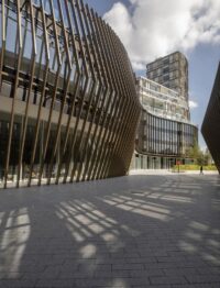 The architectural composition responds sensitively to its surroundings through graduated building heights and differentiated façades. The southern volume, closest to the station, rises to twelve stories and establishes a strong urban marker, while the northern building steps down to four stories to align with the scale of the adjacent residential neighborhood. This modulation softens the project’s impact and ensures a smooth transition between urban conditions.