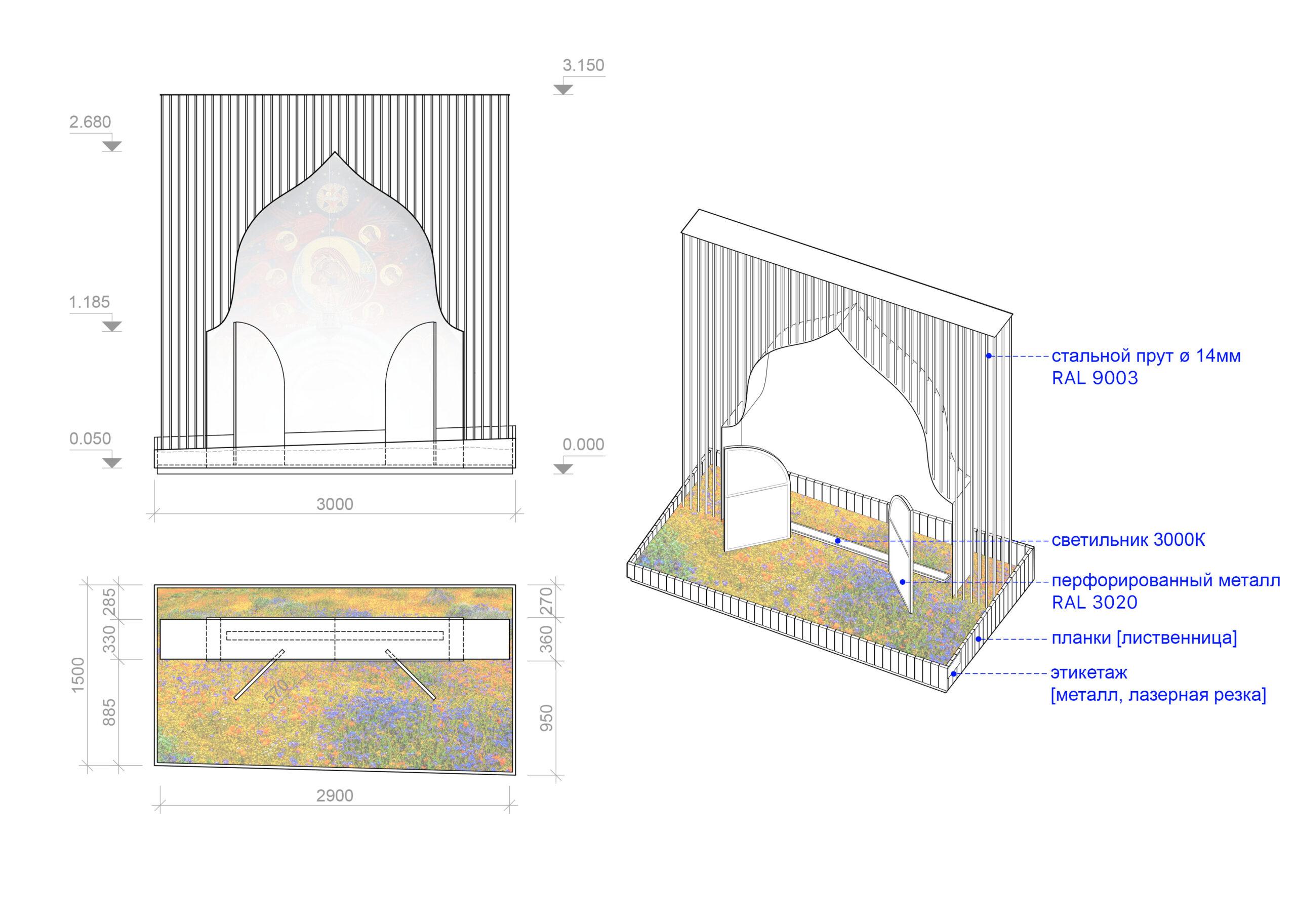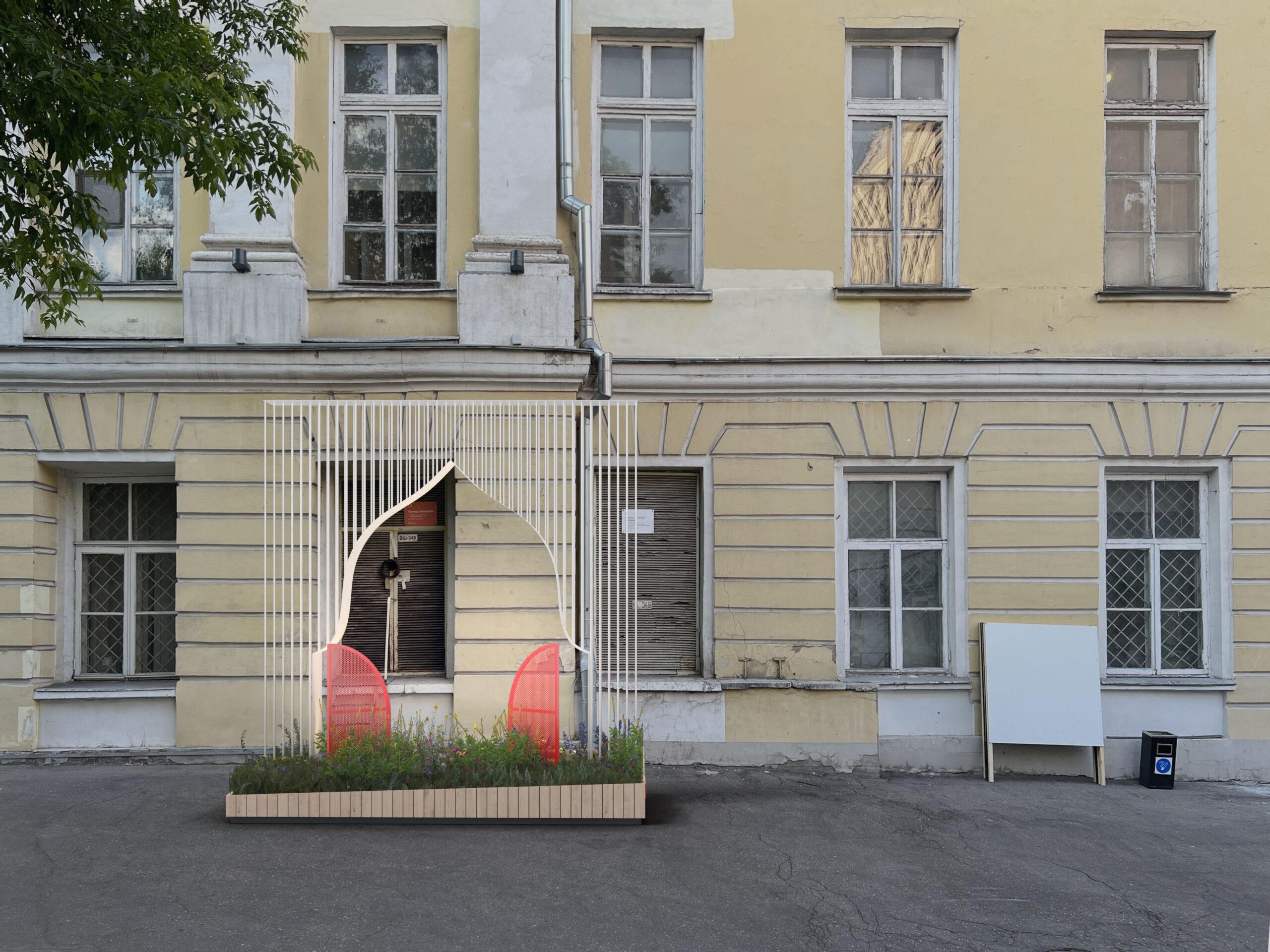 The installation does not require grounding fixtures — a stable platform doubles as a planter with perennial wildflowers. The coverage of the planter is made of wooden planks, linked with other existing wooden elements of the museum courtyard. The composition itself consists of lightweight steel round rods and screens made of perforated metal sheet. All this ensures the transportability of the composition. All materials and coatings used are stable and unpretentious in outdoor use.