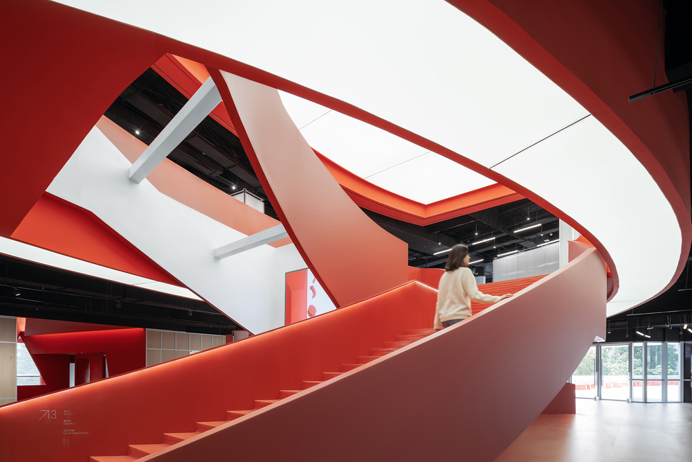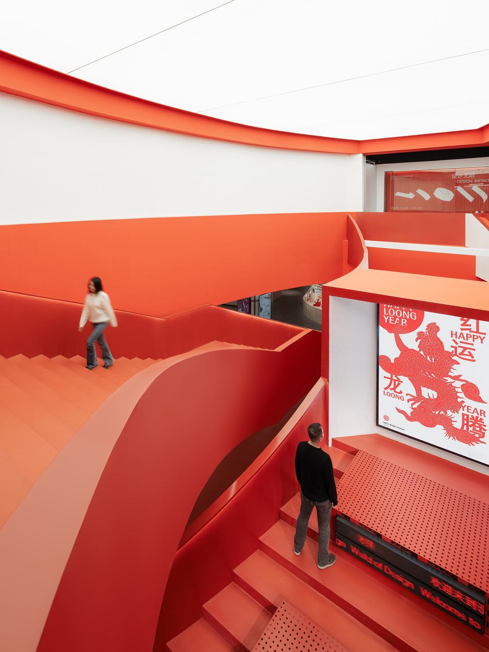 Collaborating with Network Party, we fully take advantage of the interior spatial properties of the commercial podium to form essential public spaces of the museum, which are the spaces of retail, coffee and restaurant. The atrium facing the entrance is the most distinct feature, we remove the escalators and turn it into the most iconic double-spiral red stair that serve as the visual core of the museum. The one half of the double-spiral stair facing the entrance serve as the “display