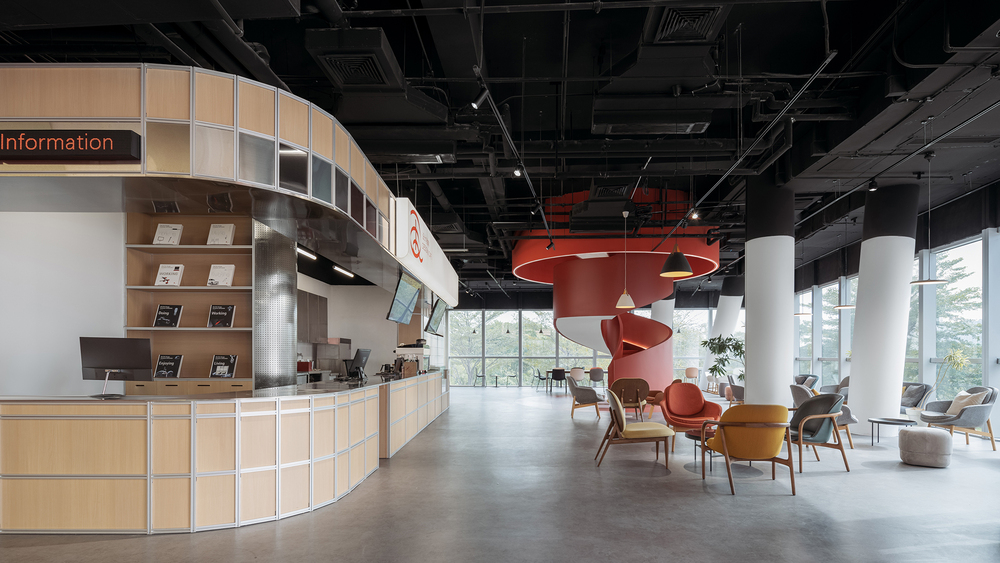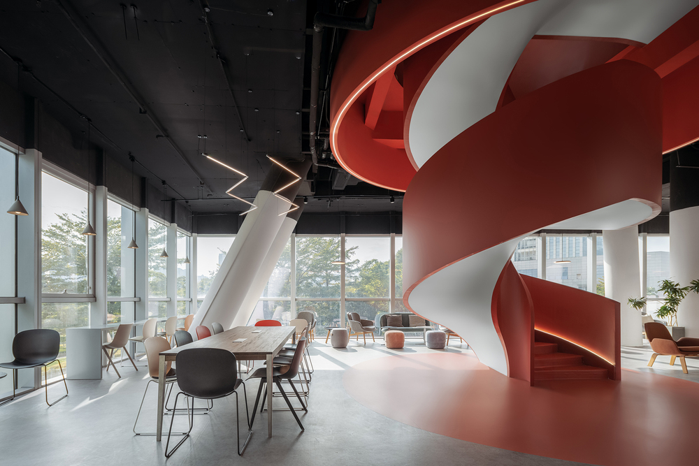 The edge spaces on 2nd and 3rd floor facing Xiamen Horticulture Expo Garden is sufficient with daylight and sceneries, we only add counters and reutilized award-winning furniture, creating comfortable coffee space and restaurant, and to connect these two spaces we implant another iconic red spiral stair.
