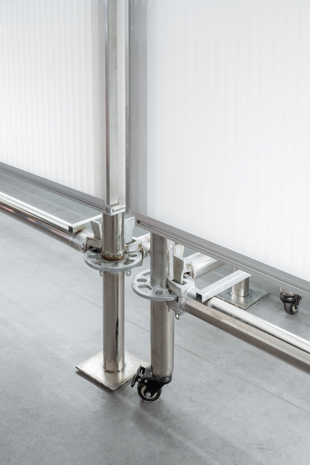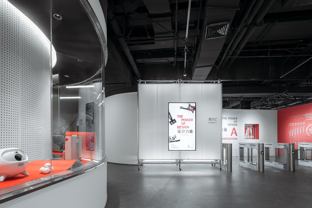 Prefabricated boundaries: We imply the thinking mode of industrial design, using prefabricating elements such as scaffolding to replace walls of exhibition hall, thus breaking the sense of a closed box of exhibition space. On one hand this meets the need of flexible exhibition spaces and cargo shipping, on the other hand this saves tremendous time and cost due to the simultaneous work on site and in factory. Moreover, the overall quality of space is elevated due to high controllability of prefabrication, which also coincide with the spirit of Red Dot Design Award that recognizes the value in top-notch industrial design.