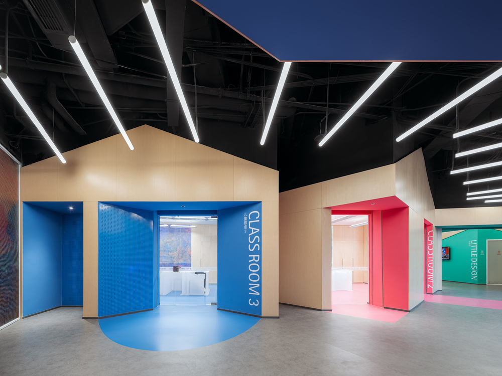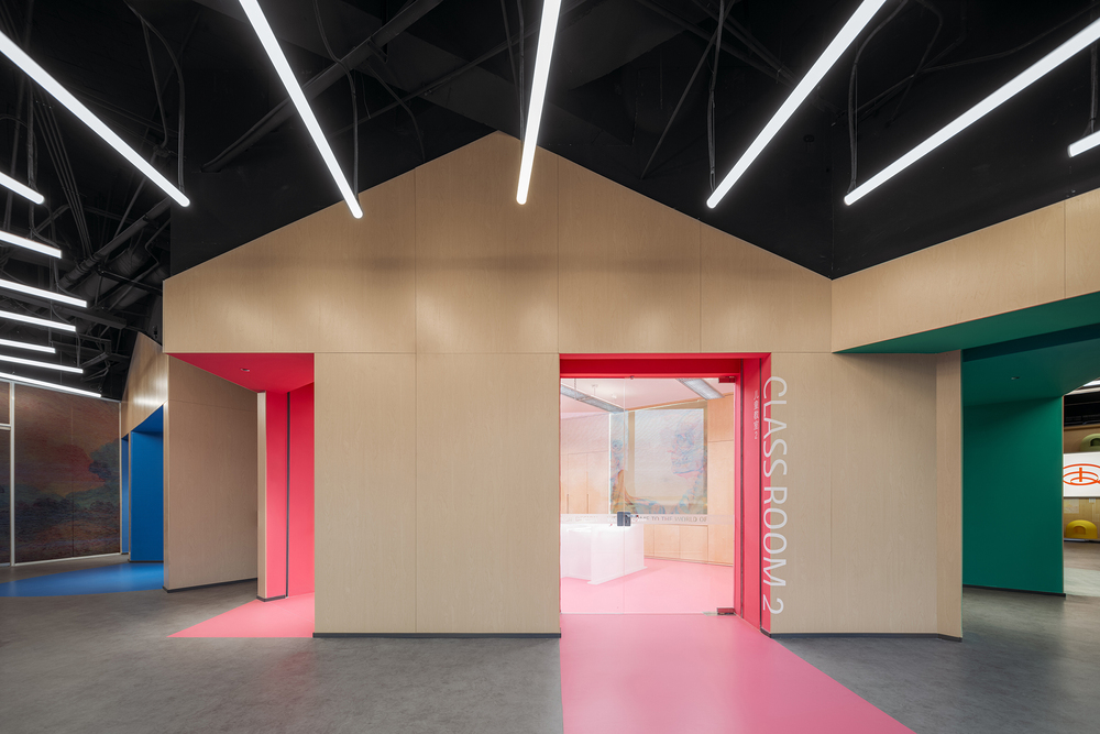 The section of museum space for children is relatively independent, including children’s classrooms and exhibition hall. We design three distinct “wood cabins” that vary in color for the three classrooms, the mass of the cabins is cut to create openings that serve as showcases for children’s artwork. The transparent classrooms also serve as free exhibition spaces when needed.