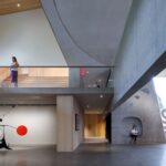 Visitors descend from the lobby via a large staircase that doubles as a small auditorium, offering elevated views of the Highway Gallery. This mezzanine connects to the Tall Gallery, allowing mobile sculptures to be experienced from varying perspectives. The Cuboid stair—a passageway lined with rough, dark concrete—links visitors to outdoor garden spaces, reinforcing the interplay between interior and exterior exhibition areas.