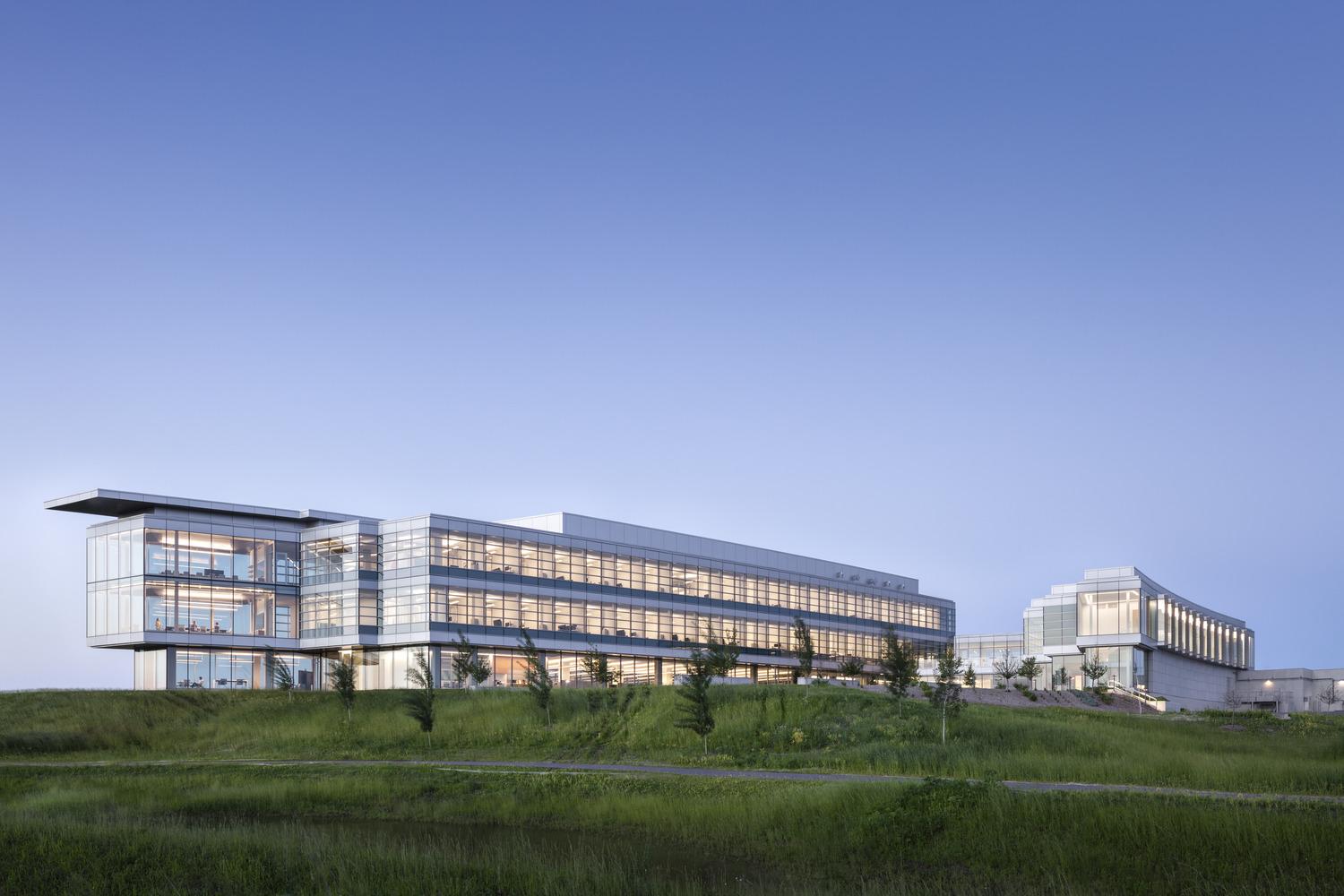 Visitors are welcomed through an entry drive along Buttonwood Court, leading to the main entrance on the second level’s eastern side. As the structure extends westward, the natural slope reveals a luminous lower level, contributing to the building’s impression of lightness and elevation. The facility’s southern section contrasts this transparency with a more solid terra cotta rainscreen system, guiding guests to this distinct area.