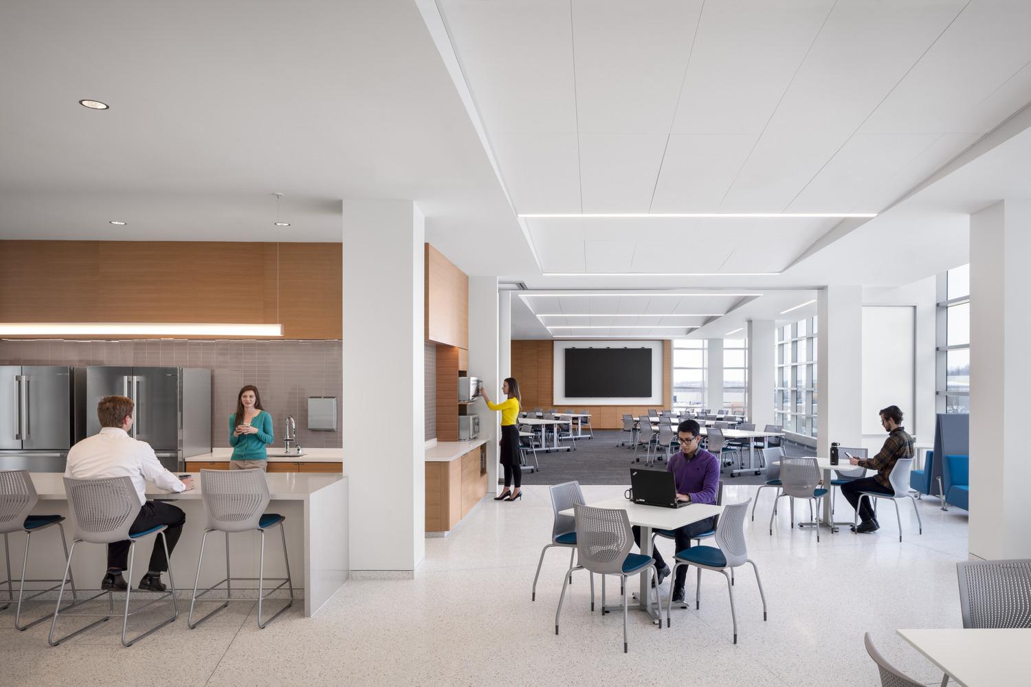 Inside, the headquarters is equipped with advanced technology and amenities, reflecting Ascendium’s commitment to its mission and staff welfare. The layout includes glass-fronted private offices, allowing natural light to permeate the open office spaces. Additionally, the building houses reflective-metal-ceiling conference rooms, casual collaborative spaces, a fitness room with bicycles for local trail exploration, and a multifunctional café. This café features a movable wall, transforming the space into a venue for training and seminars.