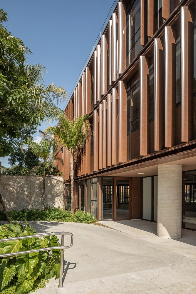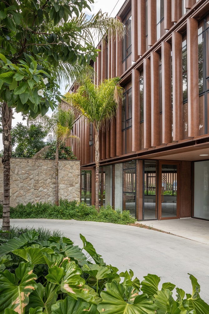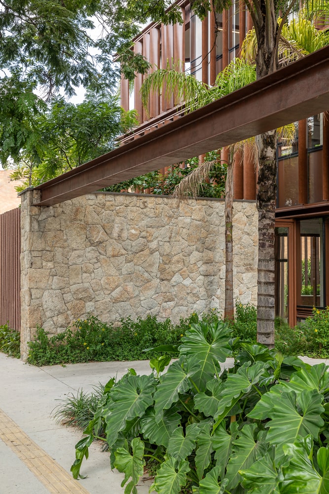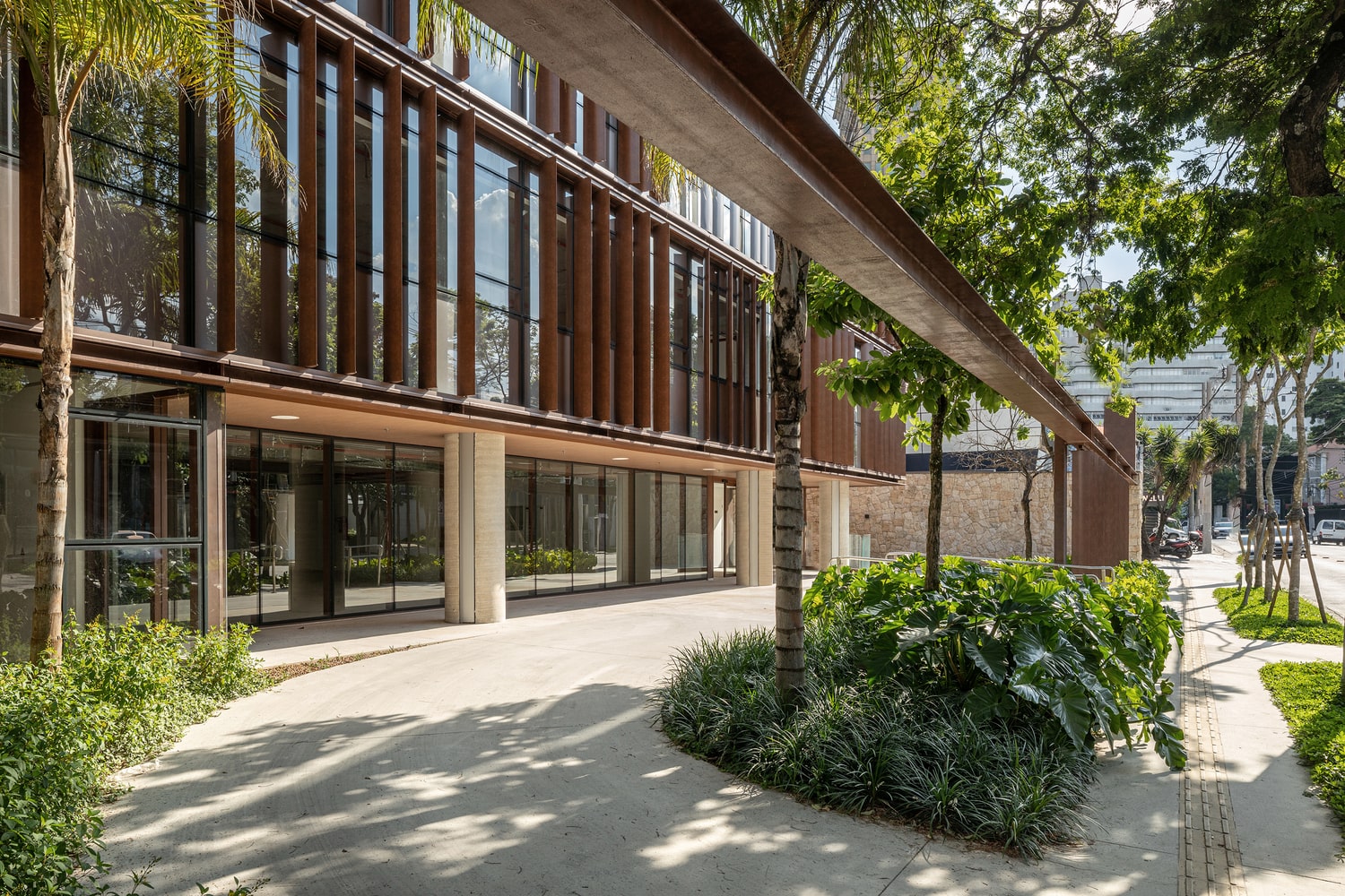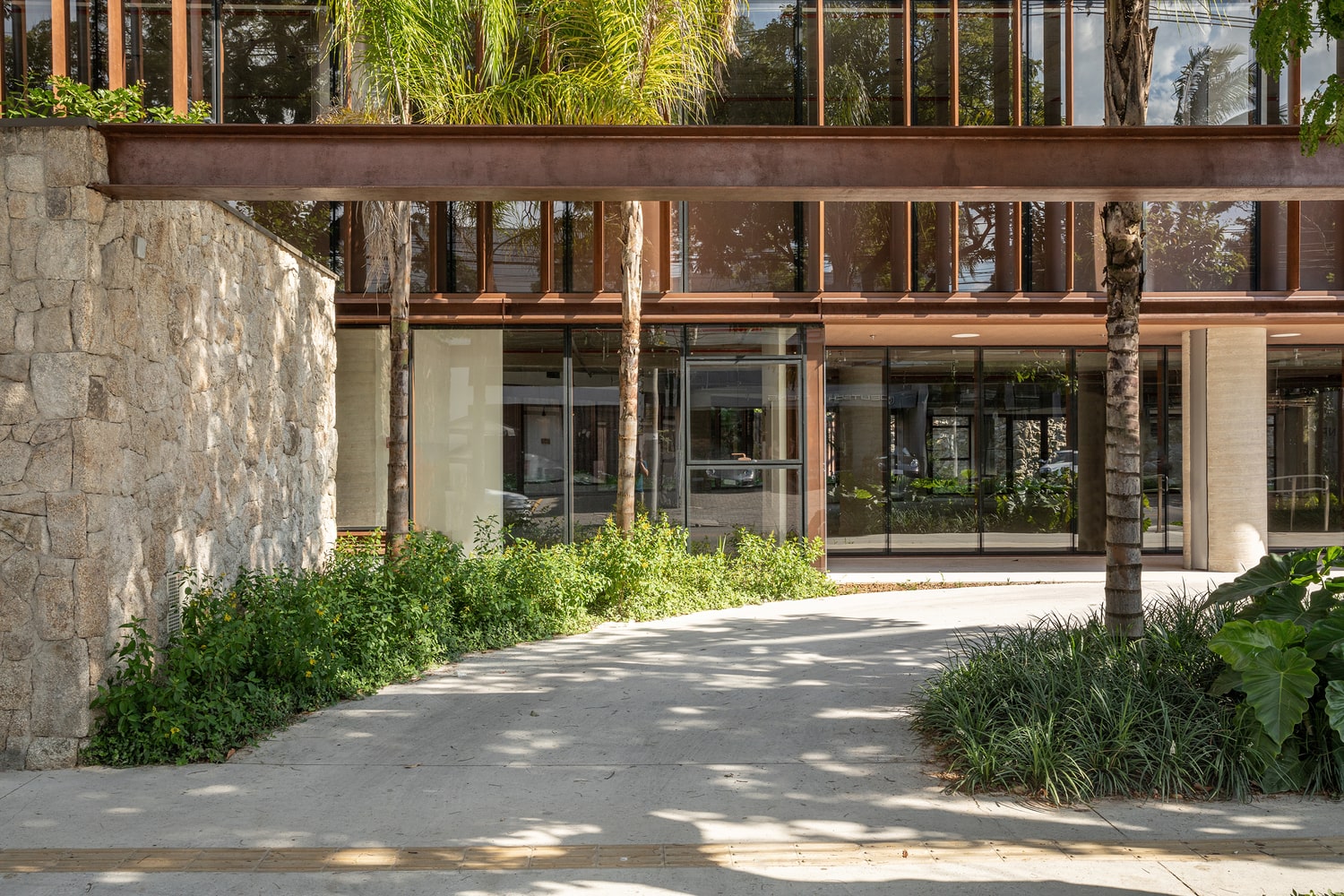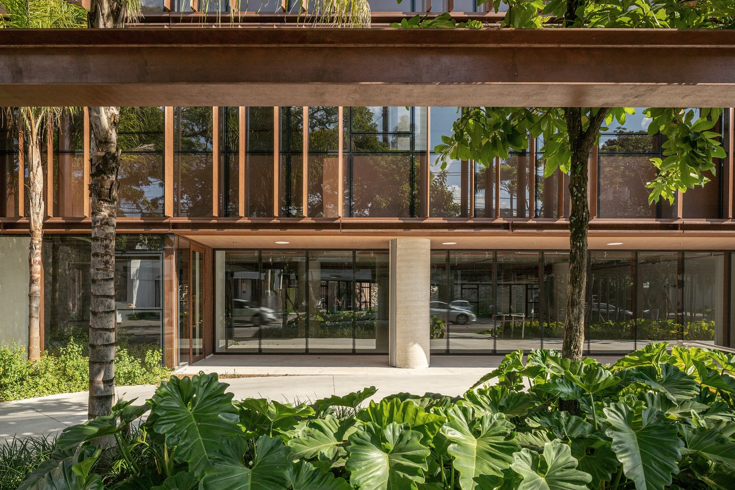 The building’s wide, column-free floorplates provide remarkable spatial flexibility while embracing the surrounding landscape. Corten steel brise-soleils offer privacy without compromising daylight access, while also framing the structure’s presence along the sidewalk. These are paired with soft stone perimeter walls that add a warm, organic tone—rooted in Brazilian design heritage.