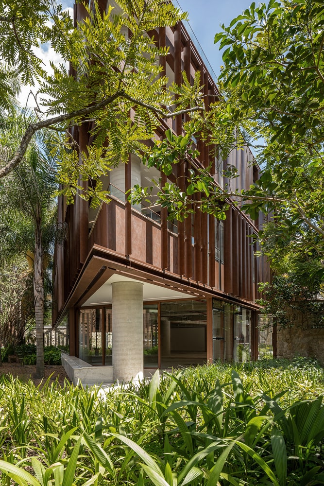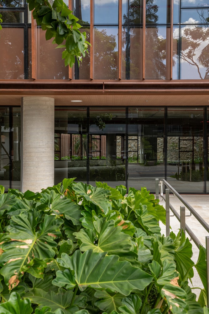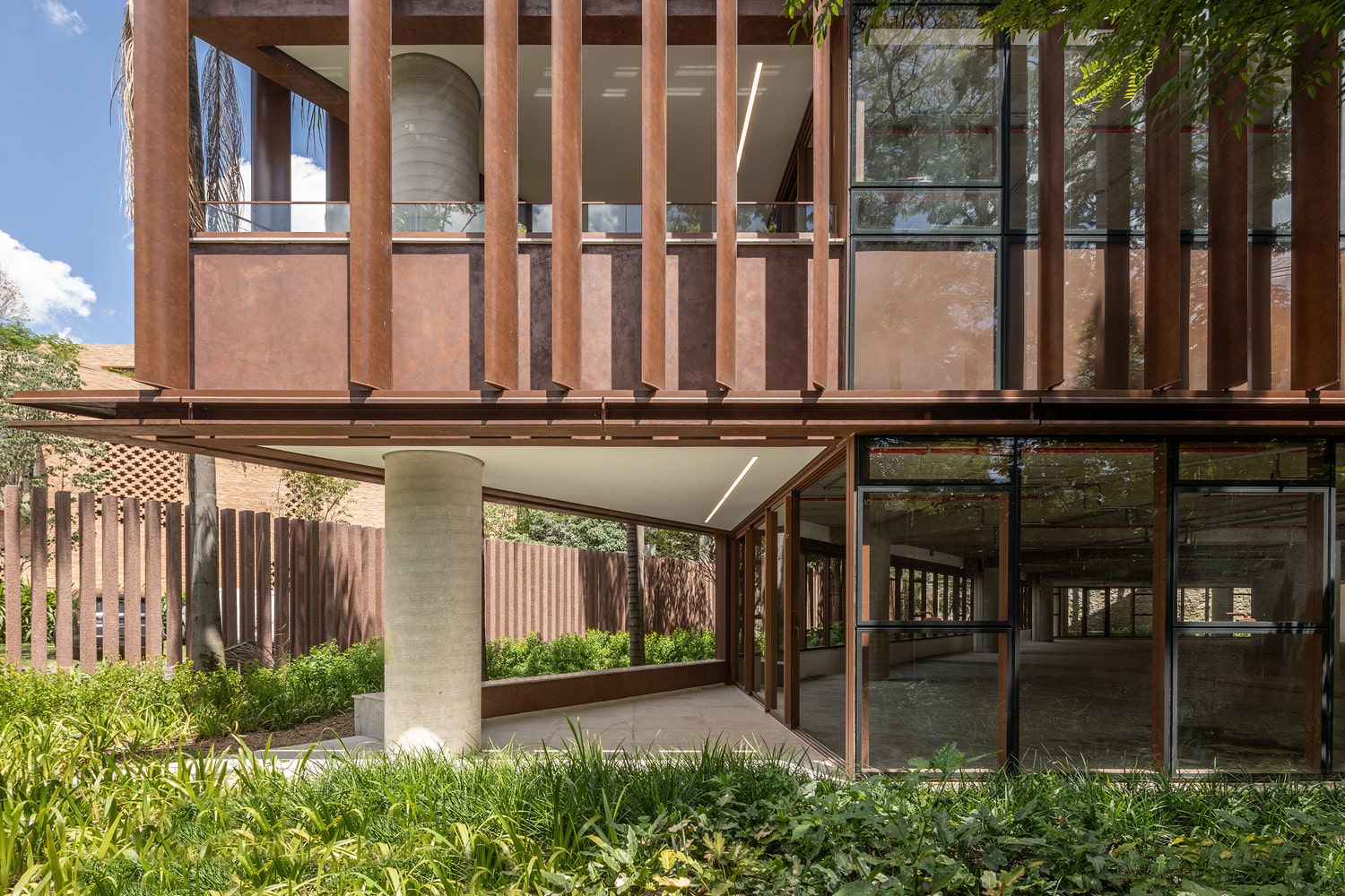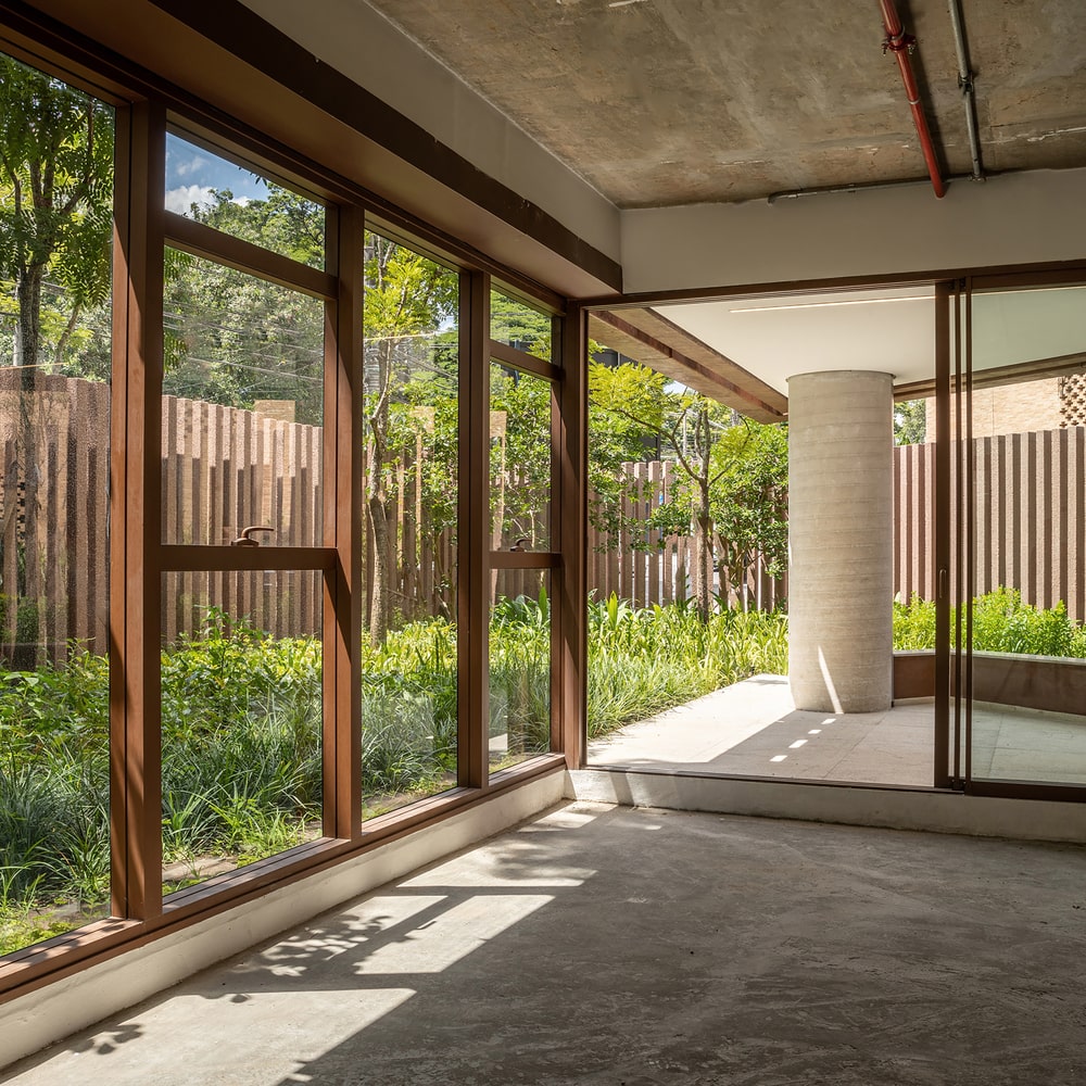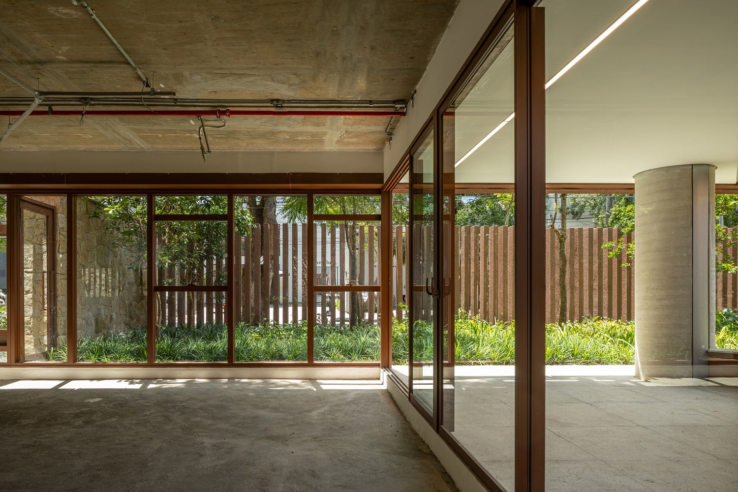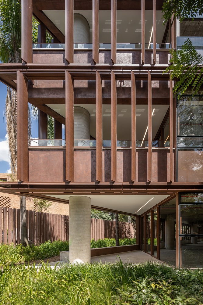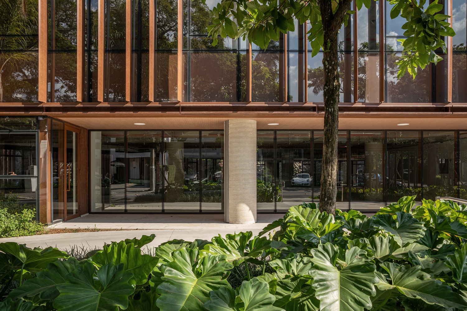 The building’s wide, column-free floorplates provide remarkable spatial flexibility while embracing the surrounding landscape. Corten steel brise-soleils offer privacy without compromising daylight access, while also framing the structure’s presence along the sidewalk. These are paired with soft stone perimeter walls that add a warm, organic tone—rooted in Brazilian design heritage.